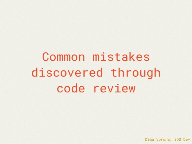During last few years Dmitriy has made numerous code-reviews and project audits and discovered lots of mistakes in iOS projects. He've gathered the most common ones and want to share them with you. They vary a lot, from stylistics to design, architecture and concept issues. In his talk Dmitry will show alternative ways to solve same problems along and avoid most common mistakes. This should improve quality of your projects, make them tidier and neater.