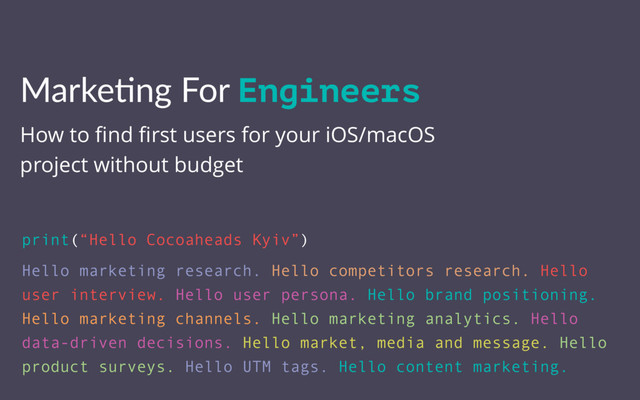 This talk will very useful for mobile developers, who would love to promote their side projects. Presentation is based on 2 years experience of running startup FlawlessApp — tool for iOS developers to compare original designs with the real app in the iOS simulator (https://flawlessapp.io/).