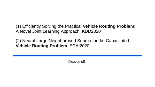 1. Efficient Solving the Practical Vehicle Routing Problem: A Novel Joint Learning Approach (KDD2020) 2. Neural Large Neighborhood Search for the Capacitated Vehicle Routing Problem (ECAI2020)