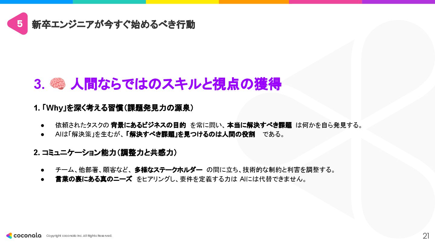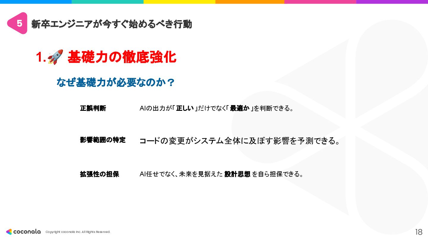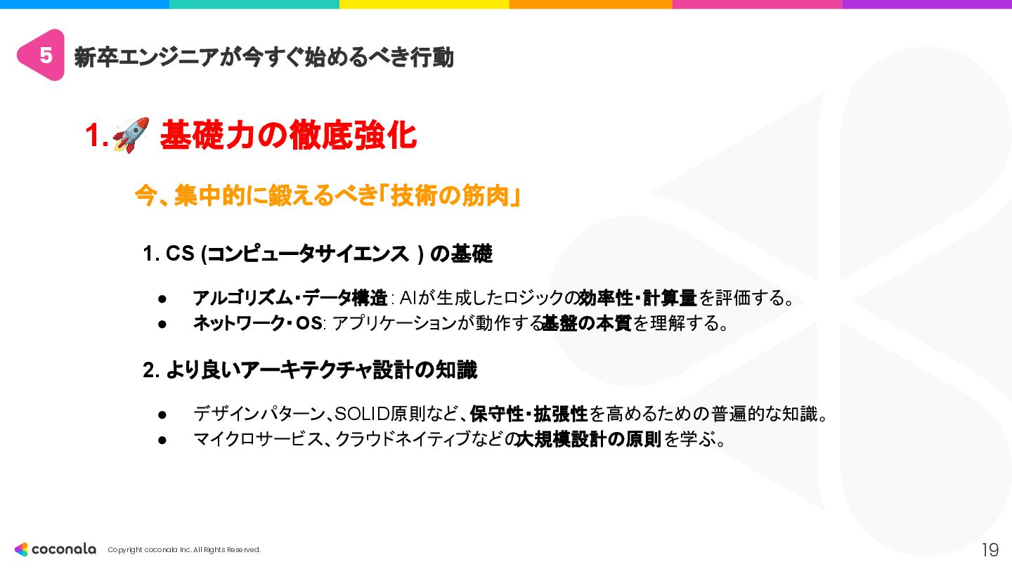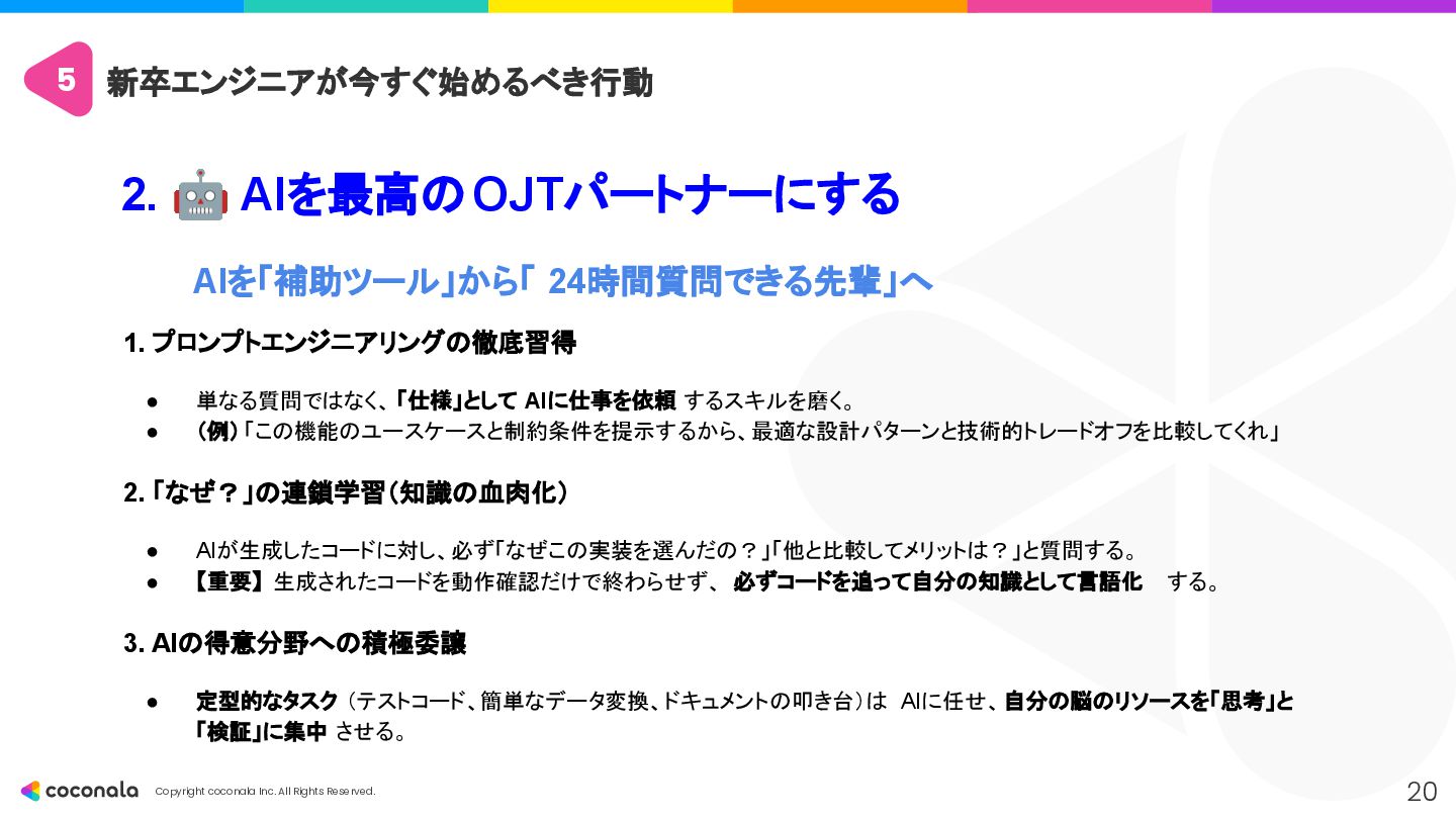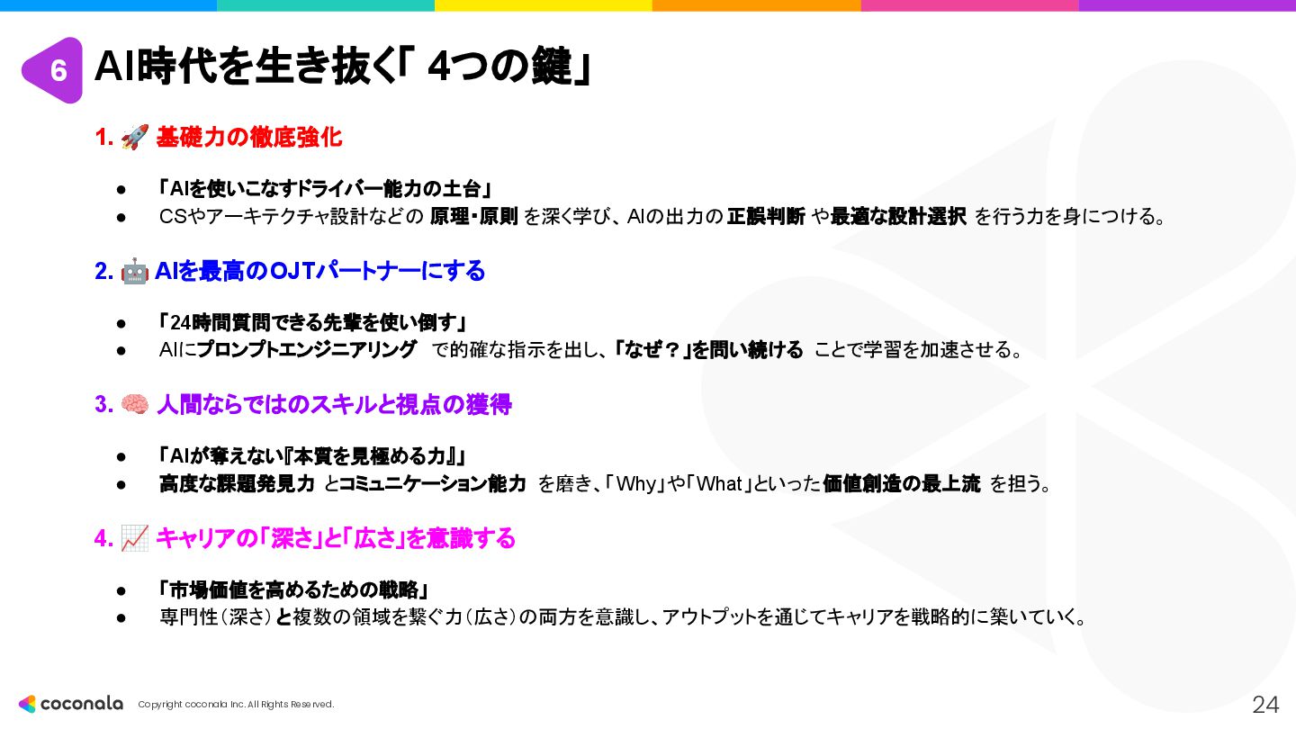 1. 🚀 基礎力の徹底強化 • 「AIを使いこなすドライバー能力の土台」 • CSやアーキテクチャ設計などの 原理・原則 を深く学び、AIの出力の正誤判断 や最適な設計選択 を行う力を身につける。 2. 🤖 AIを最高のOJTパートナーにする • 「24時間質問できる先輩を使い倒す」 • AIにプロンプトエンジニアリング で的確な指示を出し、 「なぜ?」を問い続ける ことで学習を加速させる。 3. 🧠 人間ならではのスキルと視点の獲得 • 「AIが奪えない『本質を見極める力』」 • 高度な課題発見力 とコミュニケーション能力 を磨き、「Why」や「What」といった価値創造の最上流 を担う。 4. 📈 キャリアの「深さ」と「広さ」を意識する • 「市場価値を高めるための戦略」 • 専門性(深さ)と複数の領域を繋ぐ力(広さ)の両方を意識し、アウトプットを通じてキャリアを戦略的に築いていく。