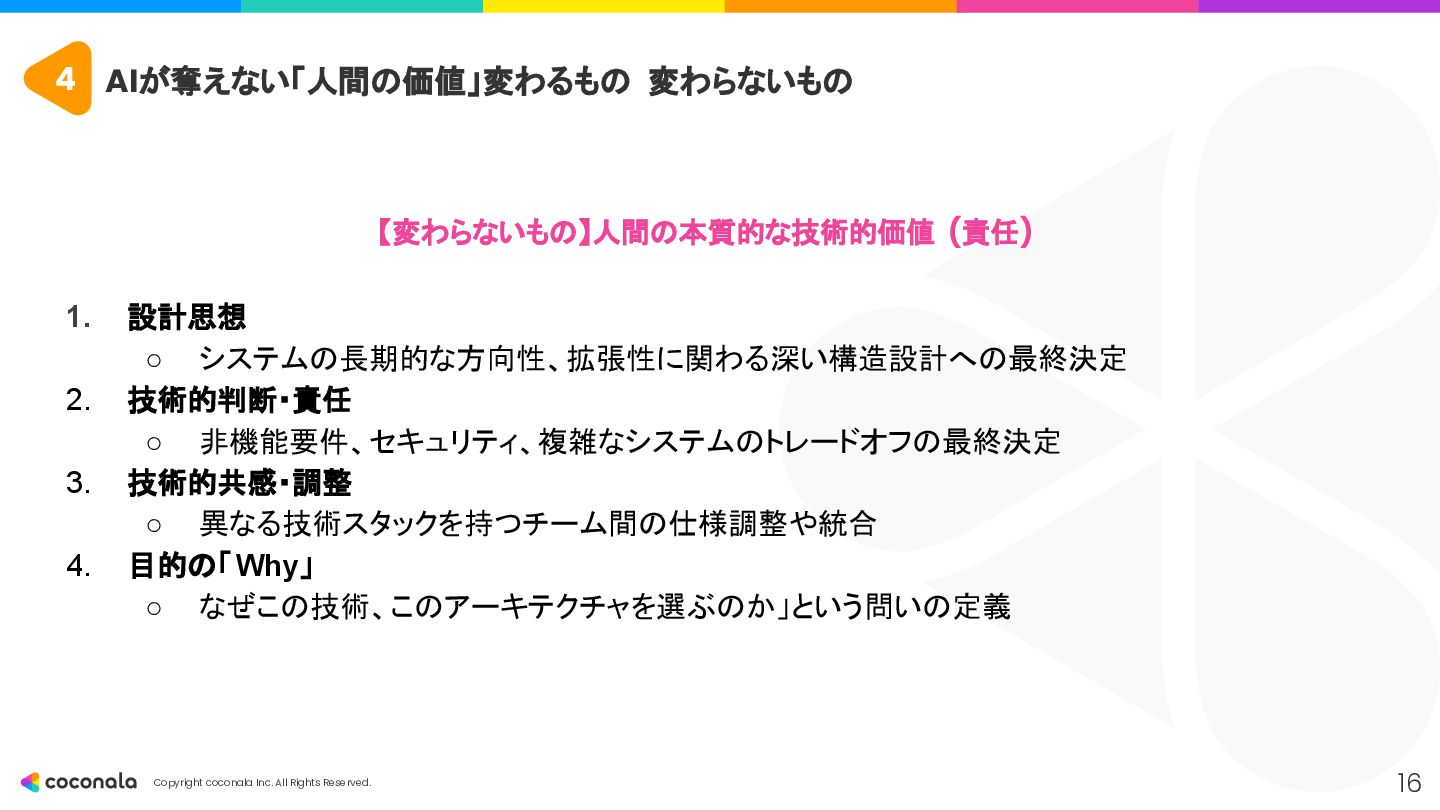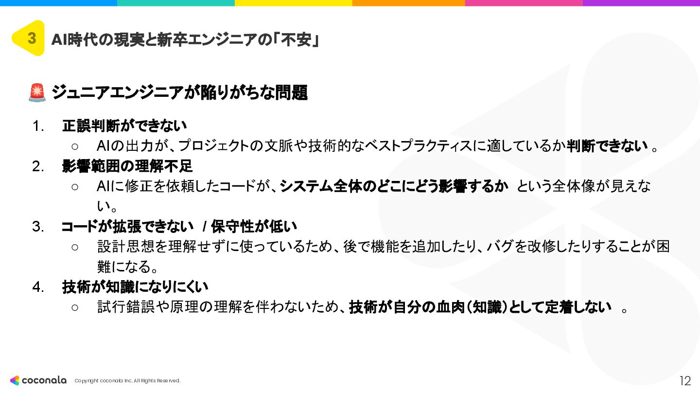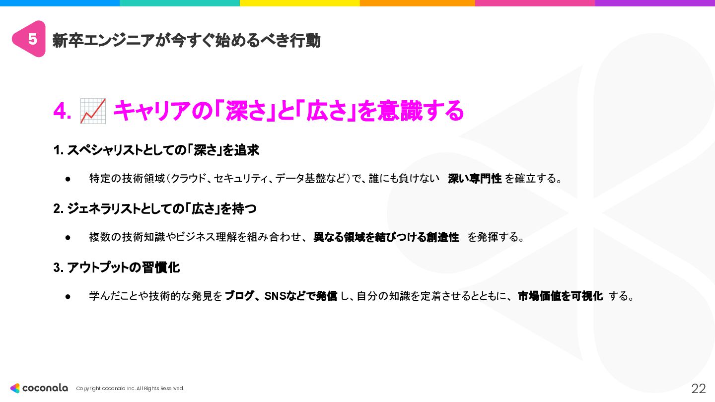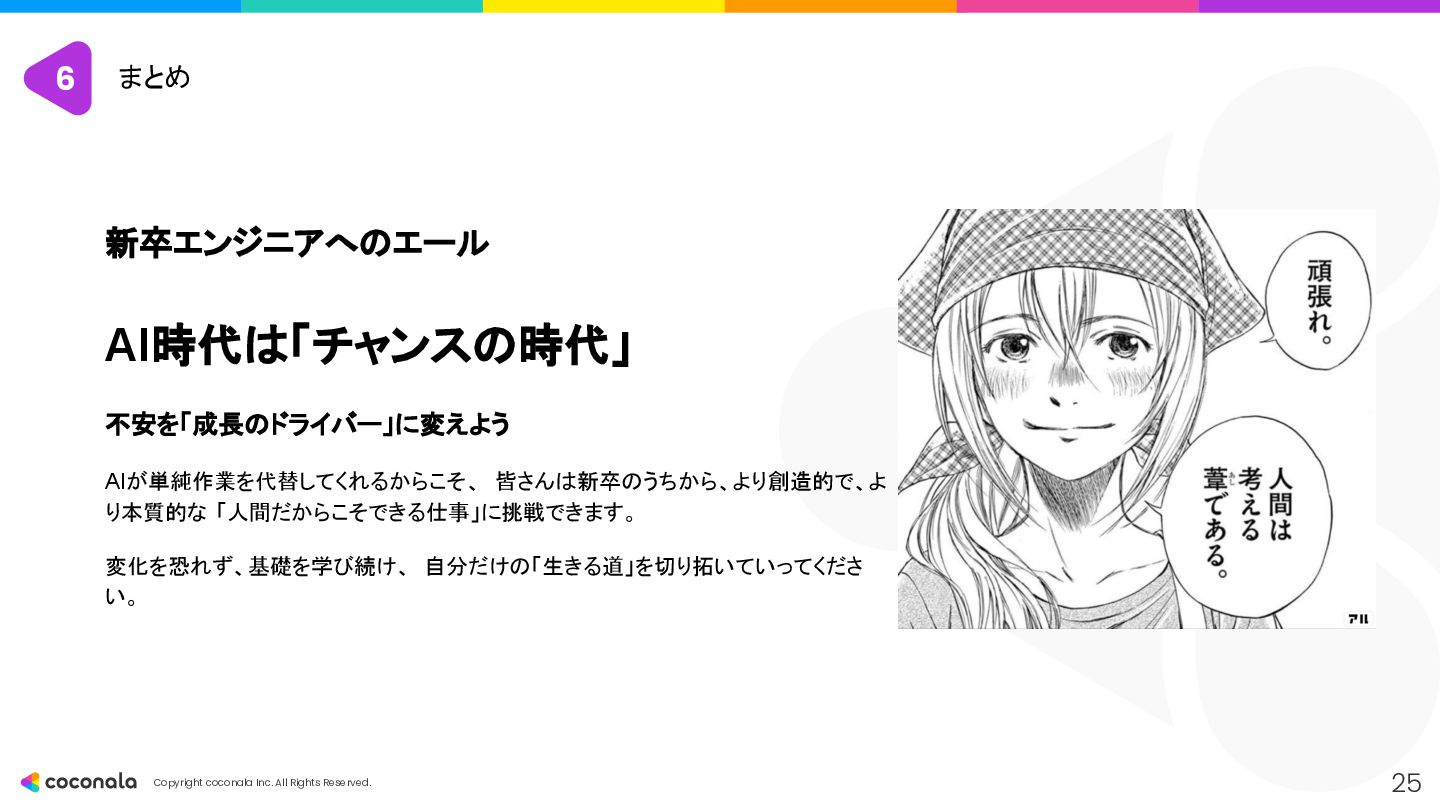 1. 🚀 基礎力の徹底強化 • 「AIを使いこなすドライバー能力の土台」 • CSやアーキテクチャ設計などの 原理・原則 を深く学び、AIの出力の正誤判断 や最適な設計選択 を行う力を身につける。 2. 🤖 AIを最高のOJTパートナーにする • 「24時間質問できる先輩を使い倒す」 • AIにプロンプトエンジニアリング で的確な指示を出し、 「なぜ?」を問い続ける ことで学習を加速させる。 3. 🧠 人間ならではのスキルと視点の獲得 • 「AIが奪えない『本質を見極める力』」 • 高度な課題発見力 とコミュニケーション能力 を磨き、「Why」や「What」といった価値創造の最上流 を担う。 4. 📈 キャリアの「深さ」と「広さ」を意識する • 「市場価値を高めるための戦略」 • 専門性(深さ)と複数の領域を繋ぐ力(広さ)の両方を意識し、アウトプットを通じてキャリアを戦略的に築いていく。