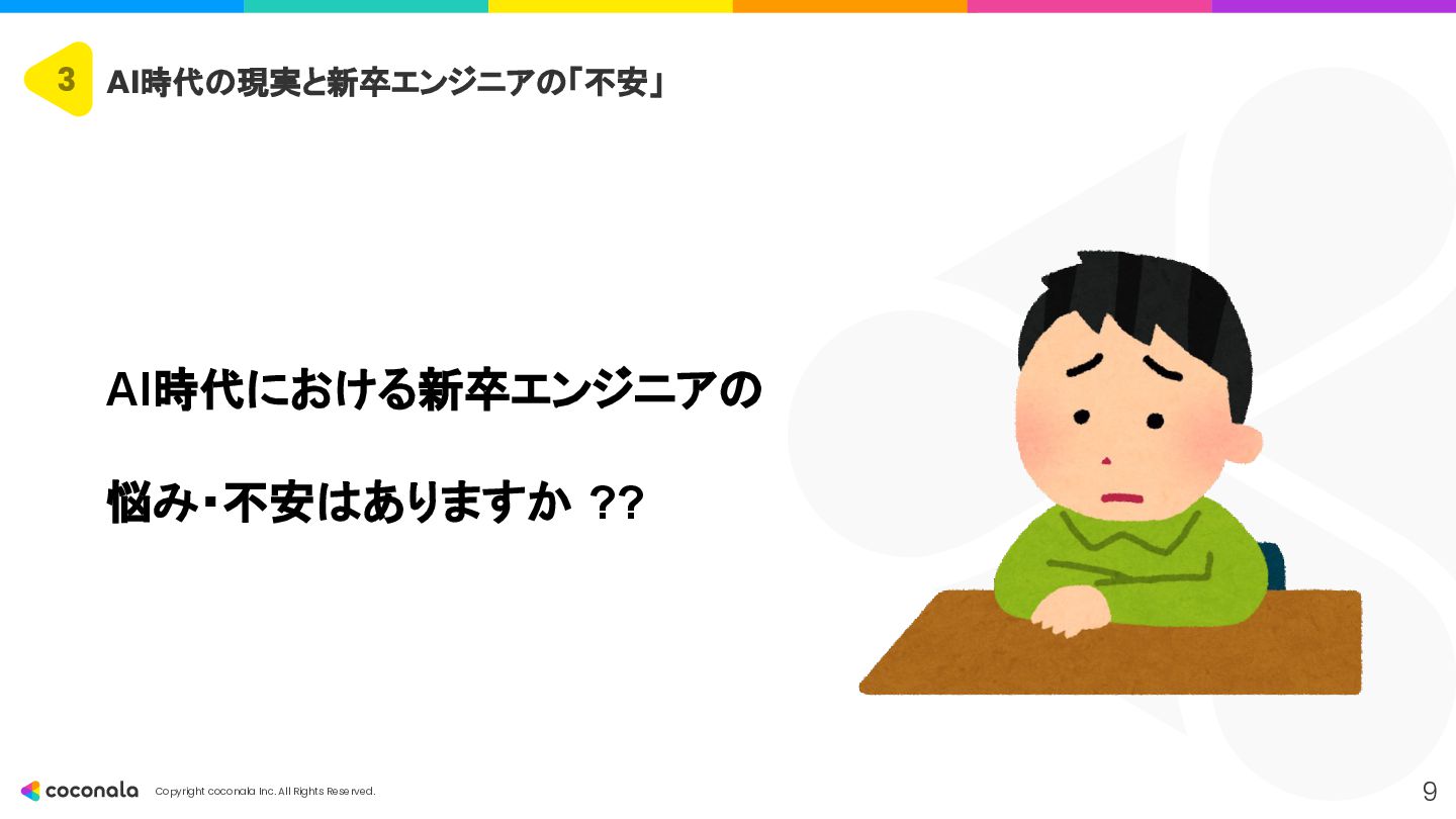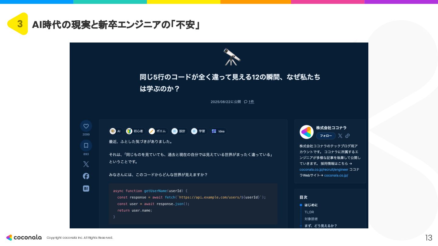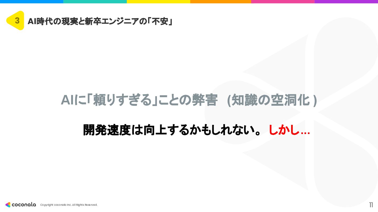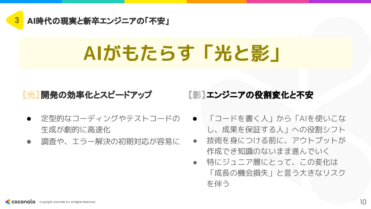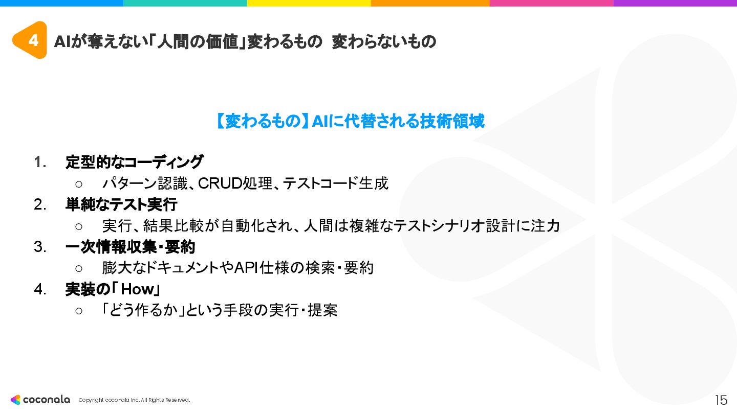 1. 🚀 基礎力の徹底強化 • 「AIを使いこなすドライバー能力の土台」 • CSやアーキテクチャ設計などの 原理・原則 を深く学び、AIの出力の正誤判断 や最適な設計選択 を行う力を身につける。 2. 🤖 AIを最高のOJTパートナーにする • 「24時間質問できる先輩を使い倒す」 • AIにプロンプトエンジニアリング で的確な指示を出し、 「なぜ?」を問い続ける ことで学習を加速させる。 3. 🧠 人間ならではのスキルと視点の獲得 • 「AIが奪えない『本質を見極める力』」 • 高度な課題発見力 とコミュニケーション能力 を磨き、「Why」や「What」といった価値創造の最上流 を担う。 4. 📈 キャリアの「深さ」と「広さ」を意識する • 「市場価値を高めるための戦略」 • 専門性(深さ)と複数の領域を繋ぐ力(広さ)の両方を意識し、アウトプットを通じてキャリアを戦略的に築いていく。