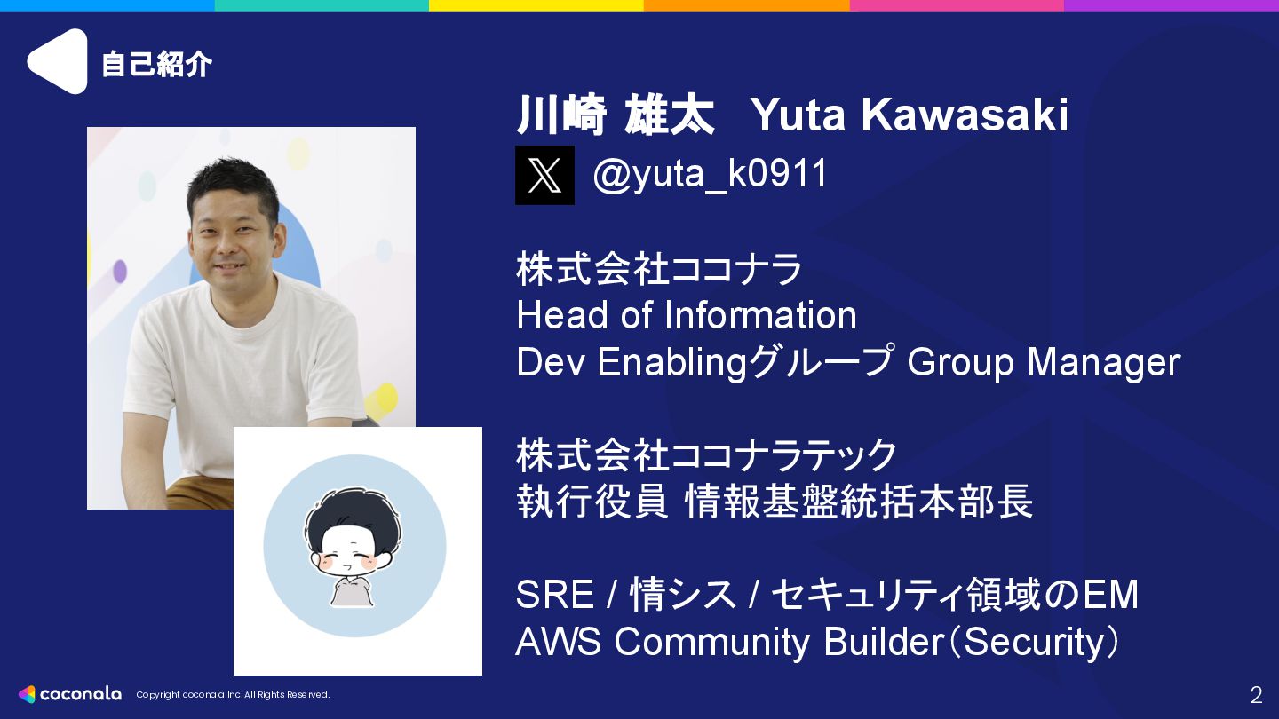 Kawasaki @yuta_k0911 株式会社ココナラ Head of Information Dev Enablingグループ Group Manager 株式会社ココナラテック 執行役員 情報基盤統括本部長 SRE / 情シス / セキュリティ領域のEM AWS Community Builder(Security)