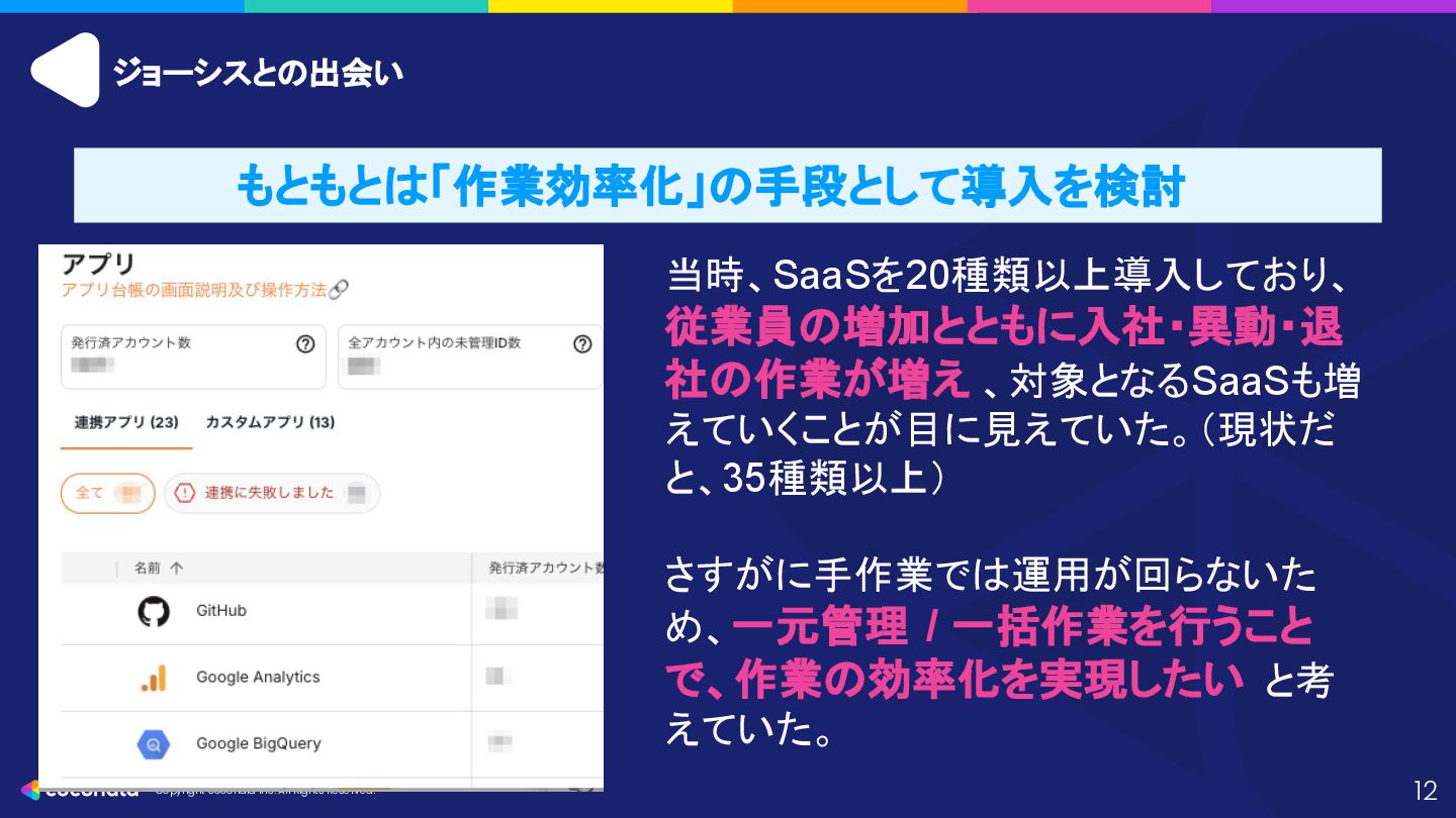 従業員の増加とともに入社・異動・退 社の作業が増え 、対象となるSaaSも増 えていくことが目に見えていた。(現状だ と、35種類以上) さすがに手作業では運用が回らないた め、一元管理 / 一括作業を行うこと で、作業の効率化を実現したい と考 えていた。