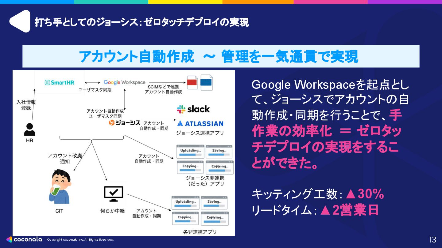 7. Copyright coconala Inc. All Rights Reserved. 打ち手としてのジョーシス:ゼロタッチデプロイの実現 13 アカウント自動作成 〜