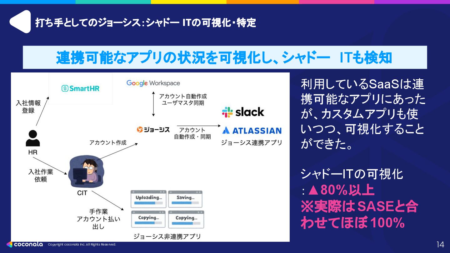 8. Copyright coconala Inc. All Rights Reserved. 打ち手としてのジョーシス:シャドー ITの可視化・特定 14 連携可能なアプリの状況を可視化し、シャドー