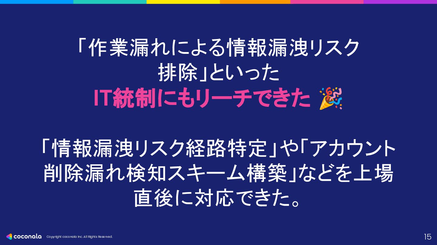 「情報漏洩リスク経路特定」や「アカウント 削除漏れ検知スキーム構築」などを上場 直後に対応できた。 15
