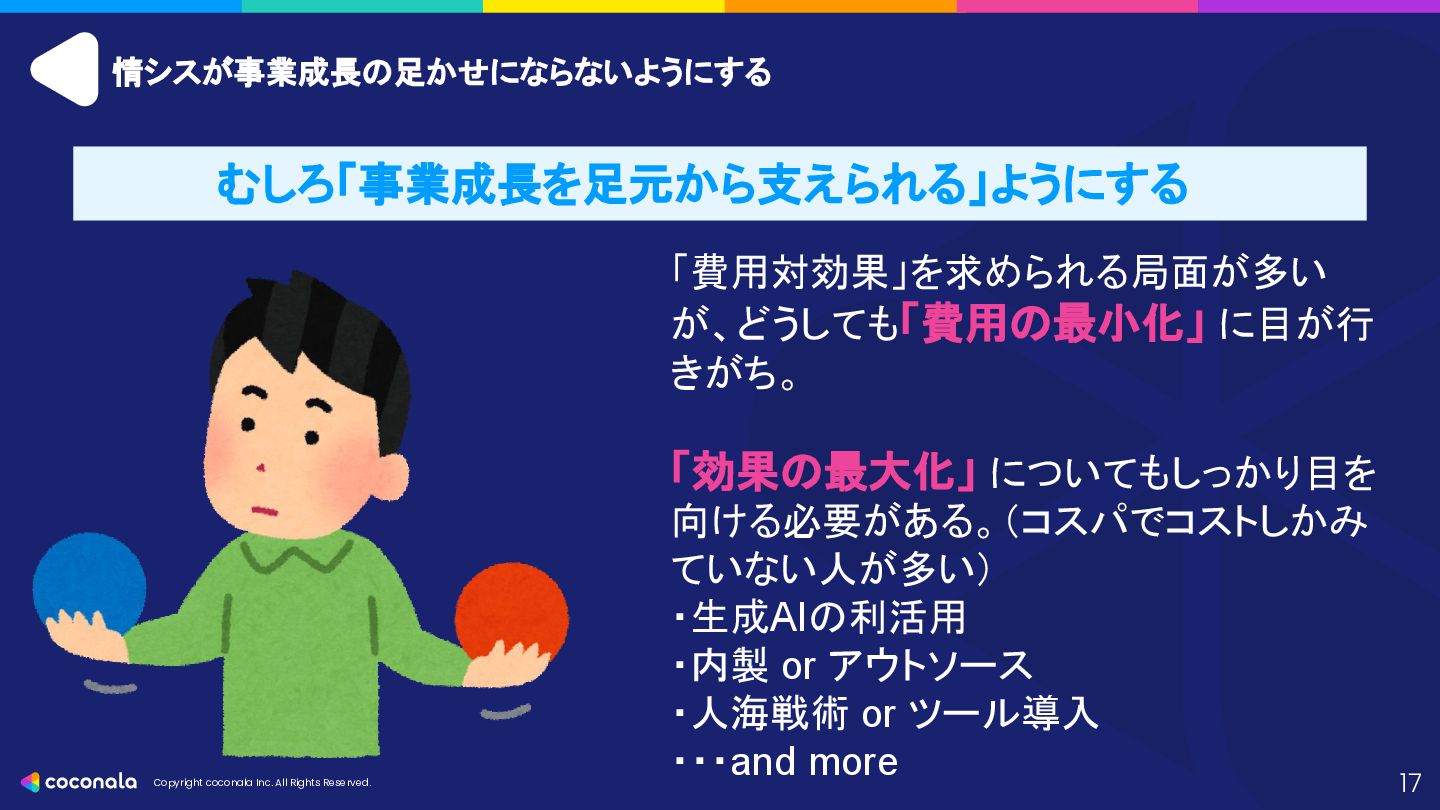 10. Copyright coconala Inc. All Rights Reserved. 情シスが事業成長の足かせにならないようにする 17 むしろ「事業成長を足元から支えられる」ようにする 「費用対効果」を求められる局面が多い