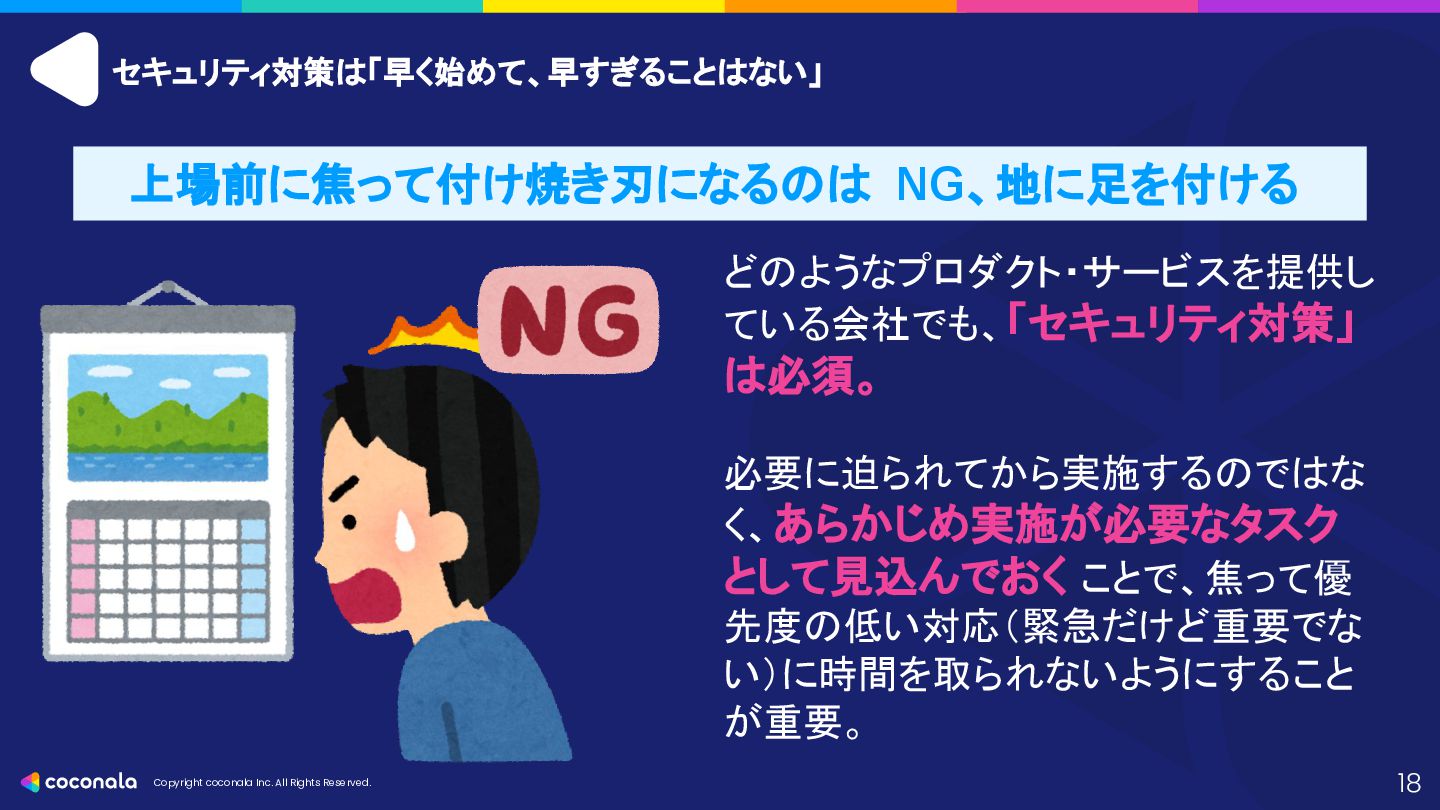 11. Copyright coconala Inc. All Rights Reserved. セキュリティ対策は「早く始めて、早すぎることはない」 18 上場前に焦って付け焼き刃になるのは NG、地に足を付ける
