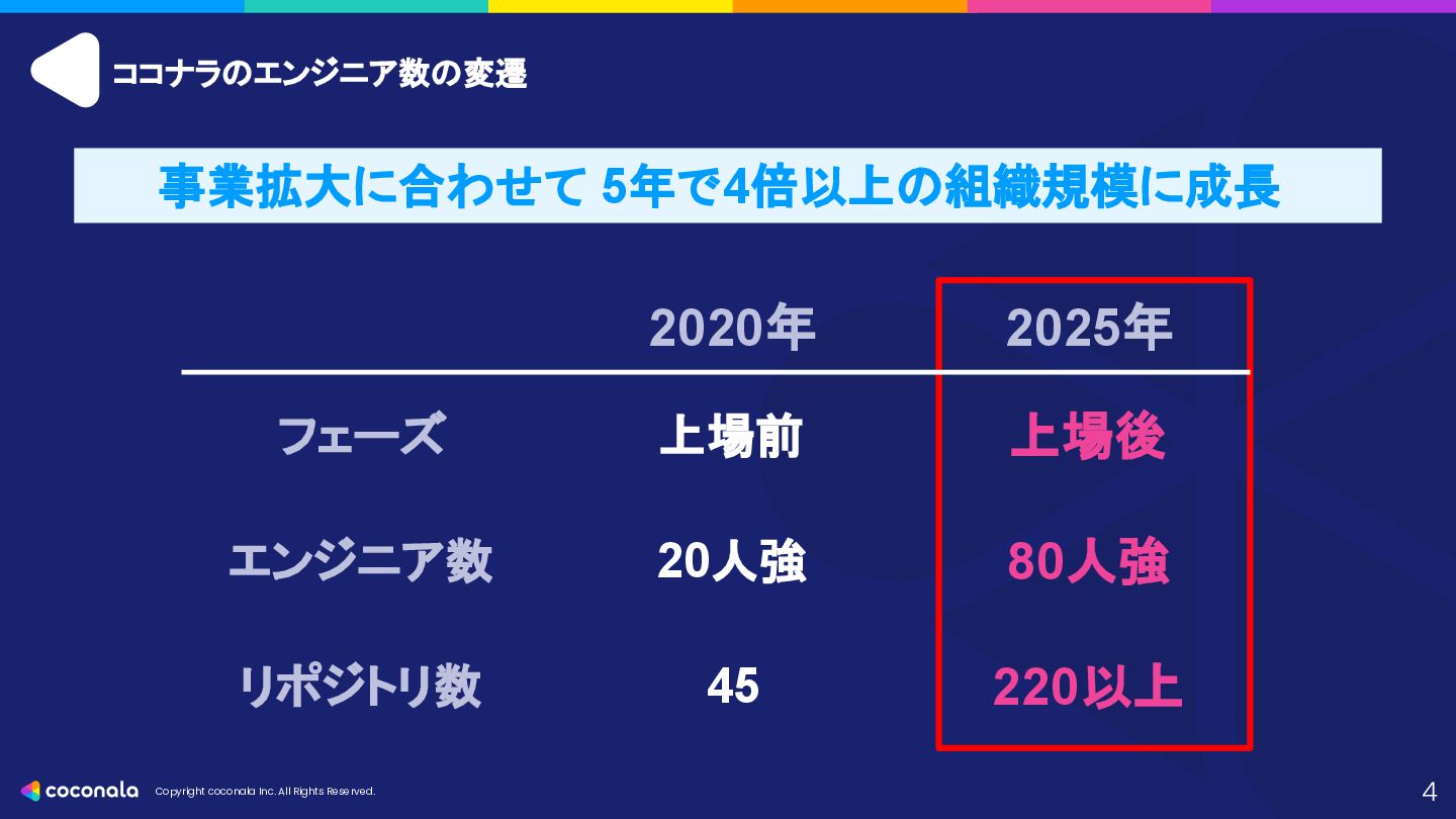 2020年 2025年 フェーズ 上場前 上場後 エンジニア数 20人強 80人強 リポジトリ数 45 220以上