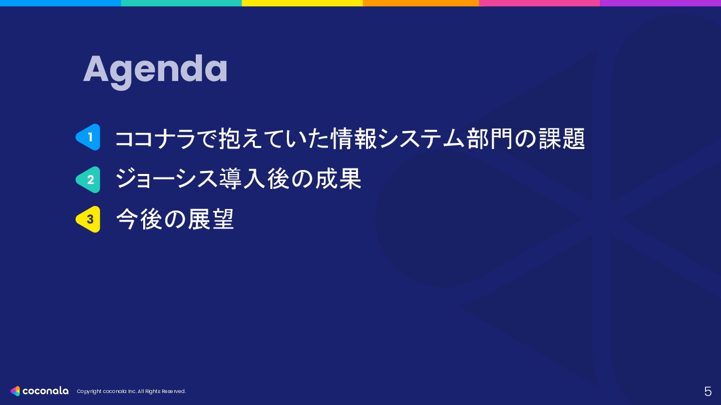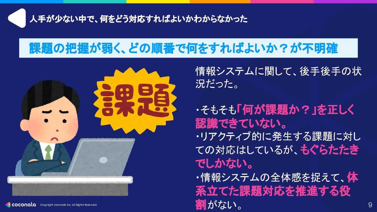 4. Copyright coconala Inc. All Rights Reserved. 人手が少ない中で、何をどう対応すればよいかわからなかった 9 課題の把握が弱く、どの順番で何をすればよいか?が不明確 情報システムに関して、後手後手の状