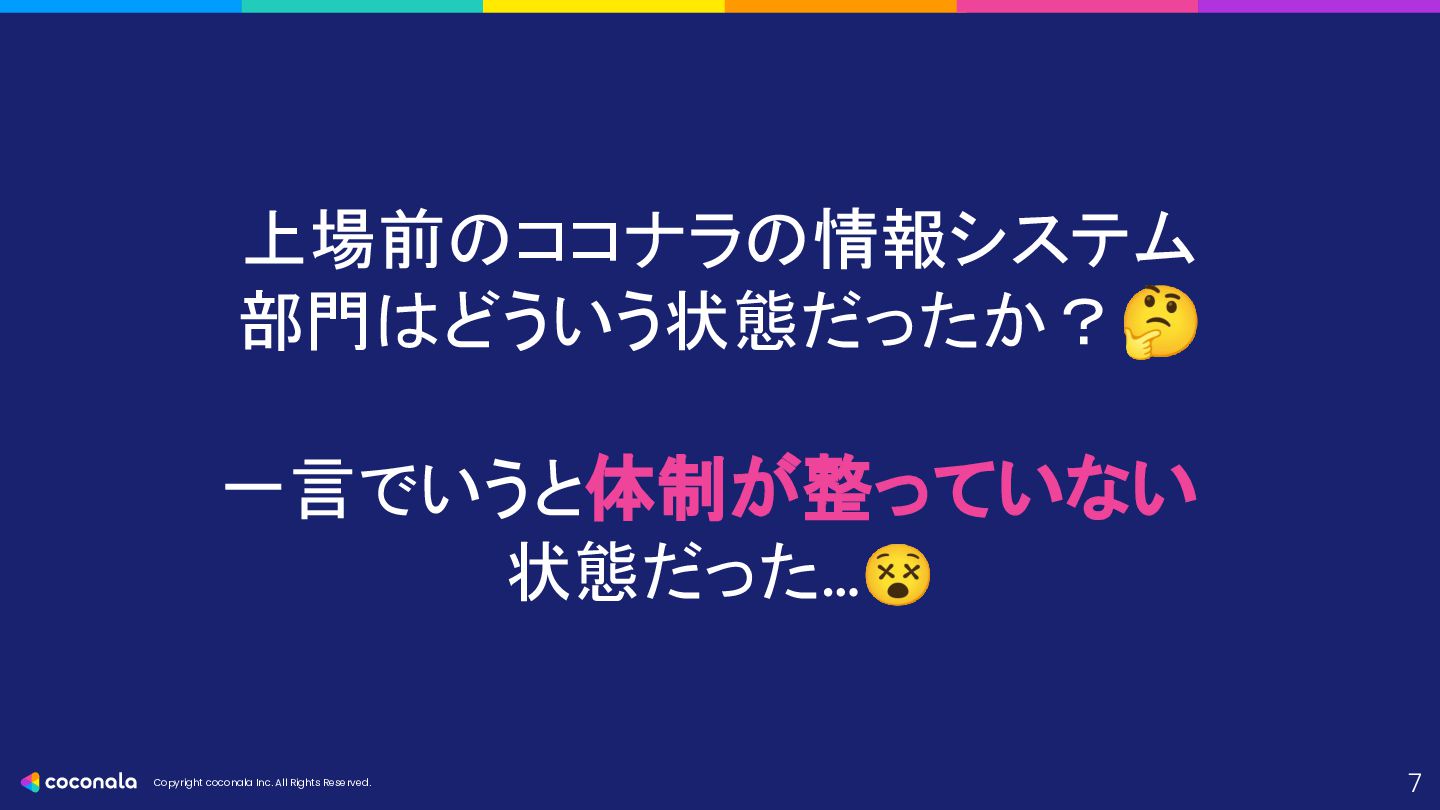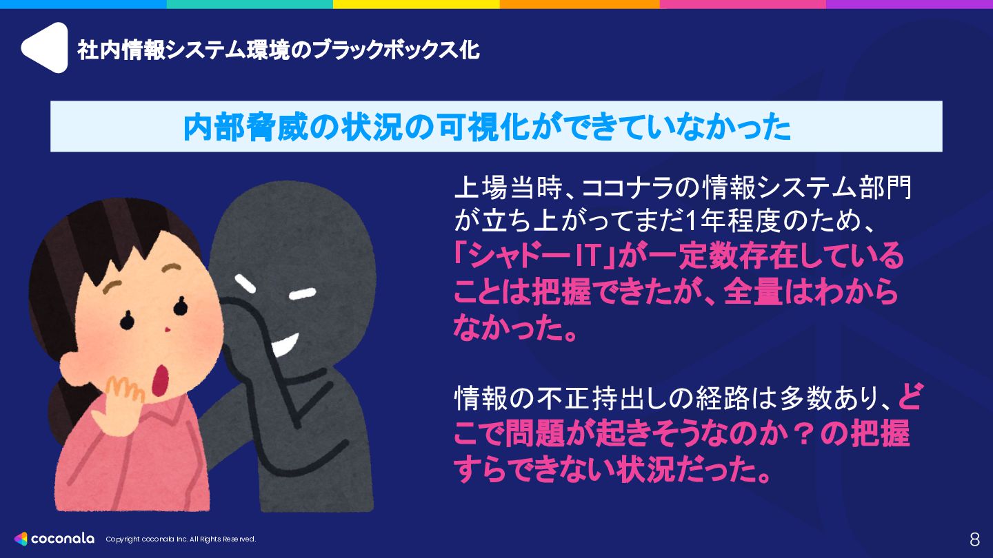 3. Copyright coconala Inc. All Rights Reserved. 社内情報システム環境のブラックボックス化 8 内部脅威の状況の可視化ができていなかった 上場当時、ココナラの情報システム部門