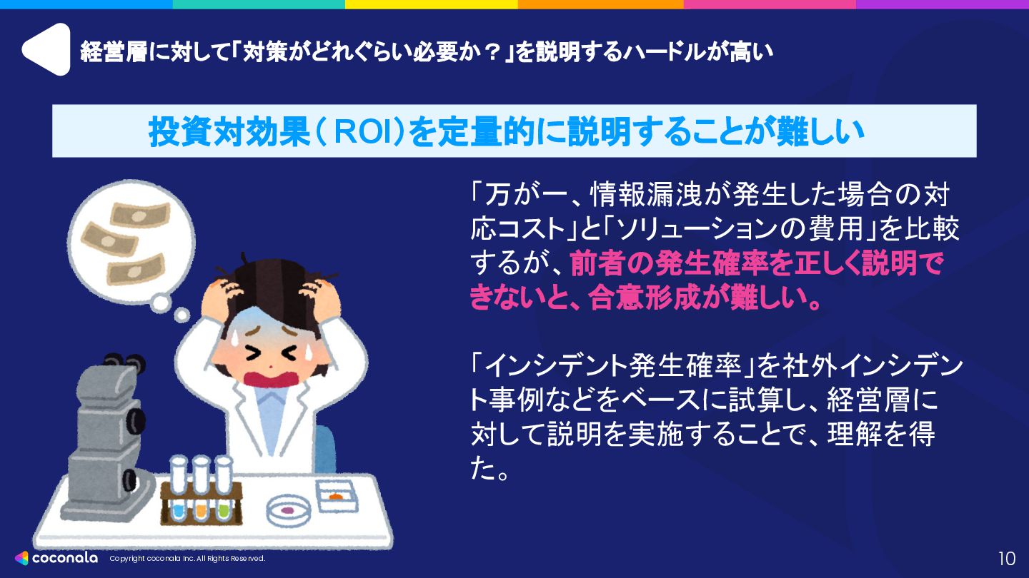 5. Copyright coconala Inc. All Rights Reserved. 経営層に対して「対策がどれぐらい必要か?」を説明するハードルが高い 10 投資対効果( ROI)を定量的に説明することが難しい