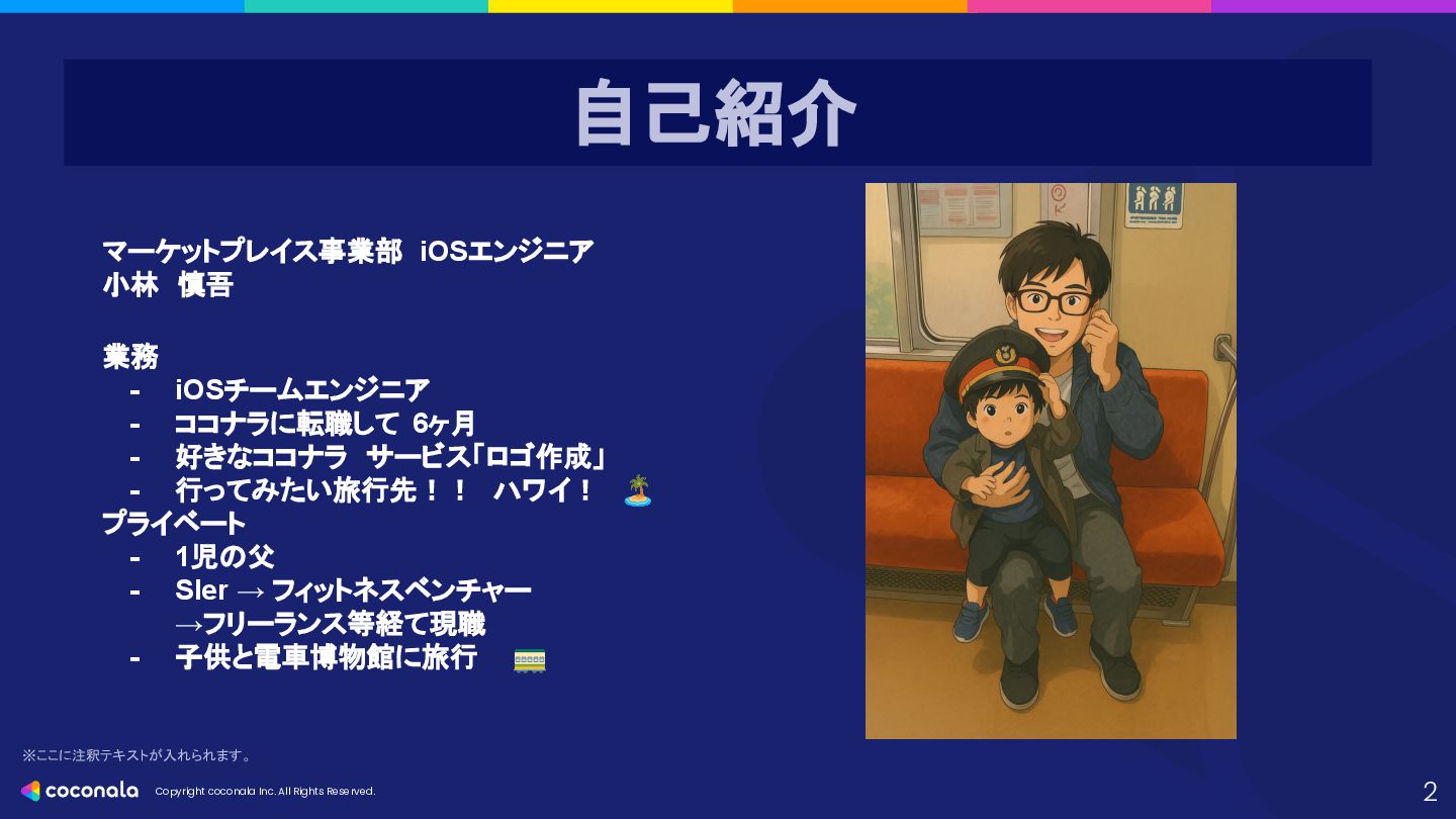 自己紹介 2 業務 - iOSチームエンジニア - ココナラに転職して 6ヶ月 - 好きなココナラ サービス「ロゴ作成」 - 行ってみたい旅行先!! ハワイ! 🏝 プライベート - 1児の父 - SIer → フィットネスベンチャー →フリーランス等経て現職 - 子供と電車博物館に旅行 🚃