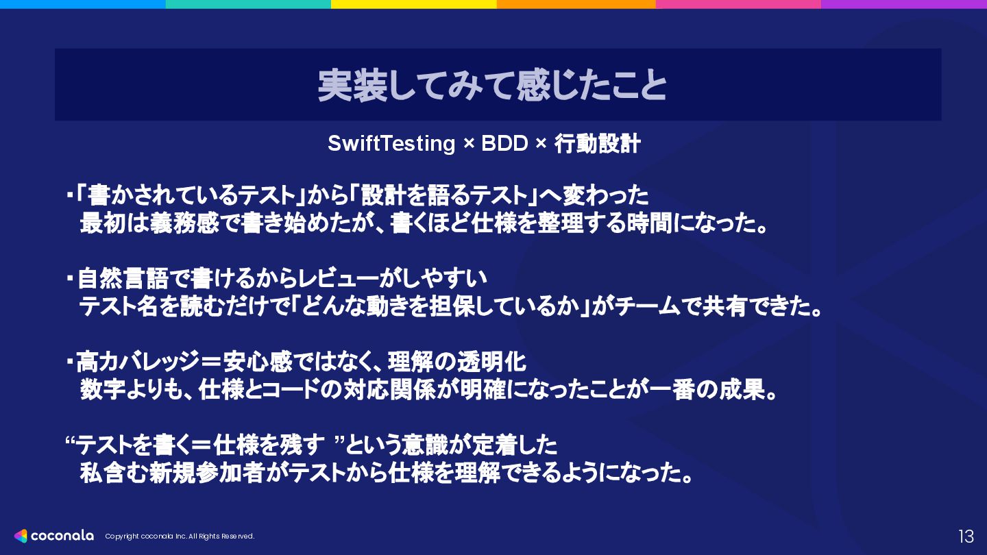 Copyright coconala Inc. All Rights Reserved. ・「書かされているテスト」から「設計を語るテスト」へ変わった 最初は義務感で書き始めたが、書くほど仕様を整理する時間になった。 ・自然言語で書けるからレビューがしやすい テスト名を読むだけで「どんな動きを担保しているか」がチームで共有できた。