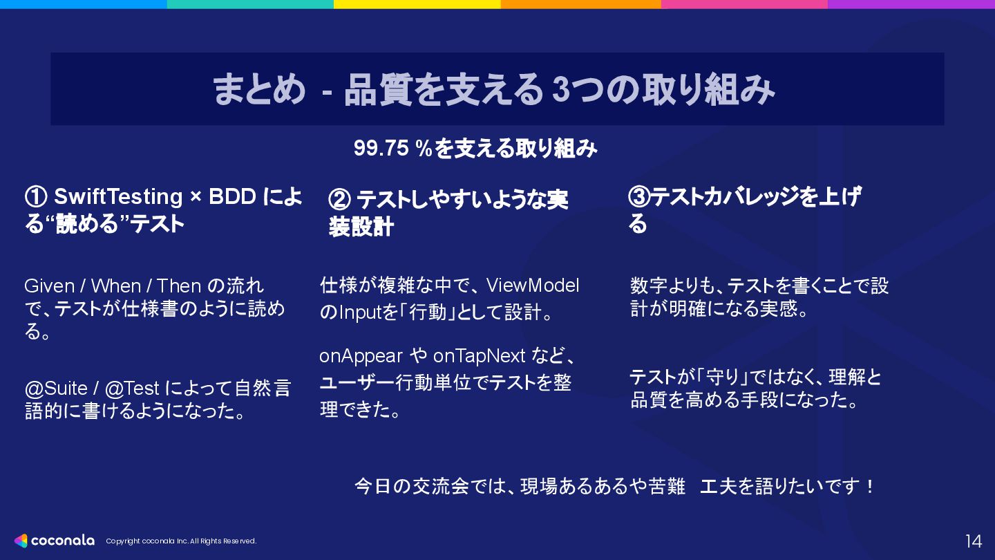 ・高カバレッジ=安心感ではなく、理解の透明化 数字よりも、仕様とコードの対応関係が明確になったことが一番の成果。 “テストを書く=仕様を残す ”という意識が定着した 私含む新規参加者がテストから仕様を理解できるようになった。 実装してみて感じたこと 13 SwiftTesting × BDD × 行動設計