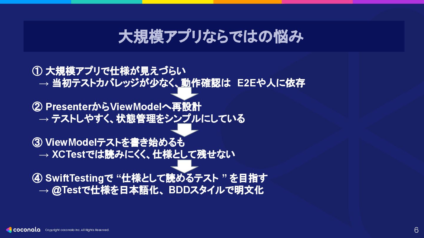 E2Eや人に依存 ② PresenterからViewModelへ再設計 → テストしやすく、状態管理をシンプルにしている ③ ViewModelテストを書き始めるも → XCTestでは読みにくく、仕様として残せない ④ SwiftTestingで “仕様として読めるテスト ” を目指す → @Testで仕様を日本語化、 BDDスタイルで明文化 大規模アプリならではの悩み 6