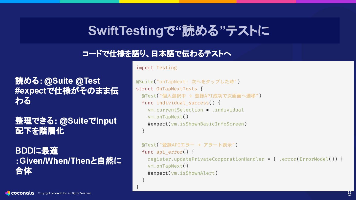 Copyright coconala Inc. All Rights Reserved. SwiftTestingで“読める”テストに 8 コードで仕様を語り、日本語で伝わるテストへ 読める:@Suite