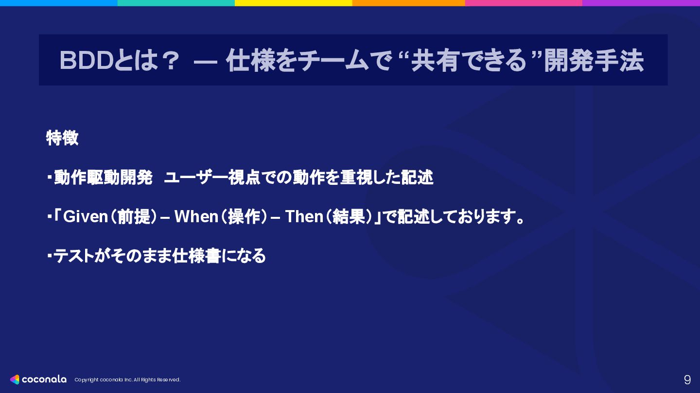 Copyright coconala Inc. All Rights Reserved. 特徴 ・動作駆動開発 ユーザー視点での動作を重視した記述 ・「Given(前提)– When(操作)–