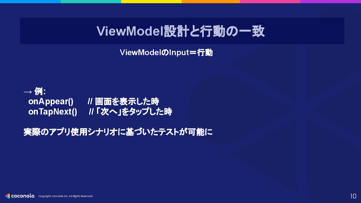 画面を表示した時 onTapNext() // 「次へ」をタップした時 実際のアプリ使用シナリオに基づいたテストが可能に ViewModel設計と行動の一致 10 ViewModelのInput=行動