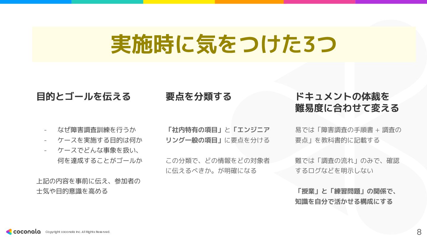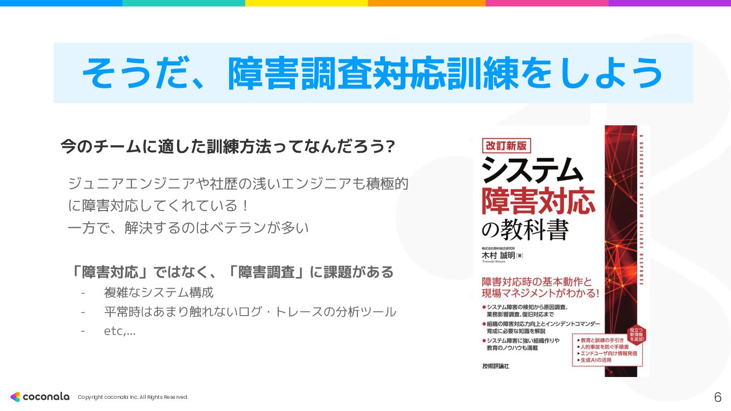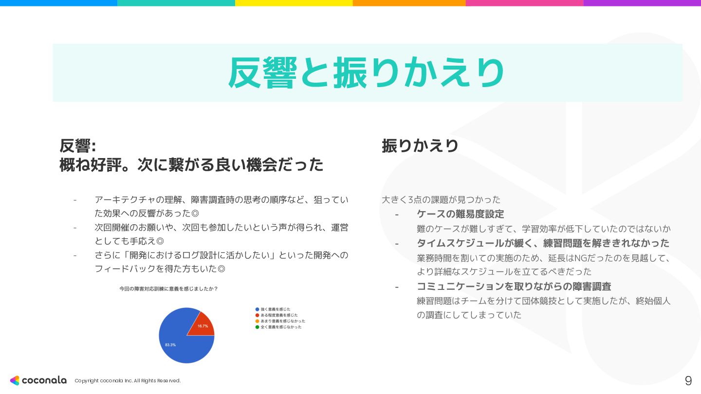 た効果への反響があった◎ - 次回開催のお願いや、次回も参加したいという声が得られ、運営 としても手応え◎ - さらに「開発におけるログ設計に活かしたい」といった開発への フィードバックを得た方もいた◎ 振りかえり 大きく3点の課題が見つかった - ケースの難易度設定 難のケースが難しすぎて、学習効率が低下していたのではないか - タイムスケジュールが緩く、練習問題を解ききれなかった 業務時間を割いての実施のため、延長はNGだったのを見越して、 より詳細なスケジュールを立てるべきだった - コミュニケーションを取りながらの障害調査 練習問題はチームを分けて団体競技として実施したが、終始個人 の調査にしてしまっていた 反響と振りかえり 9
