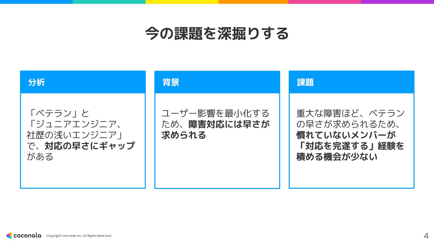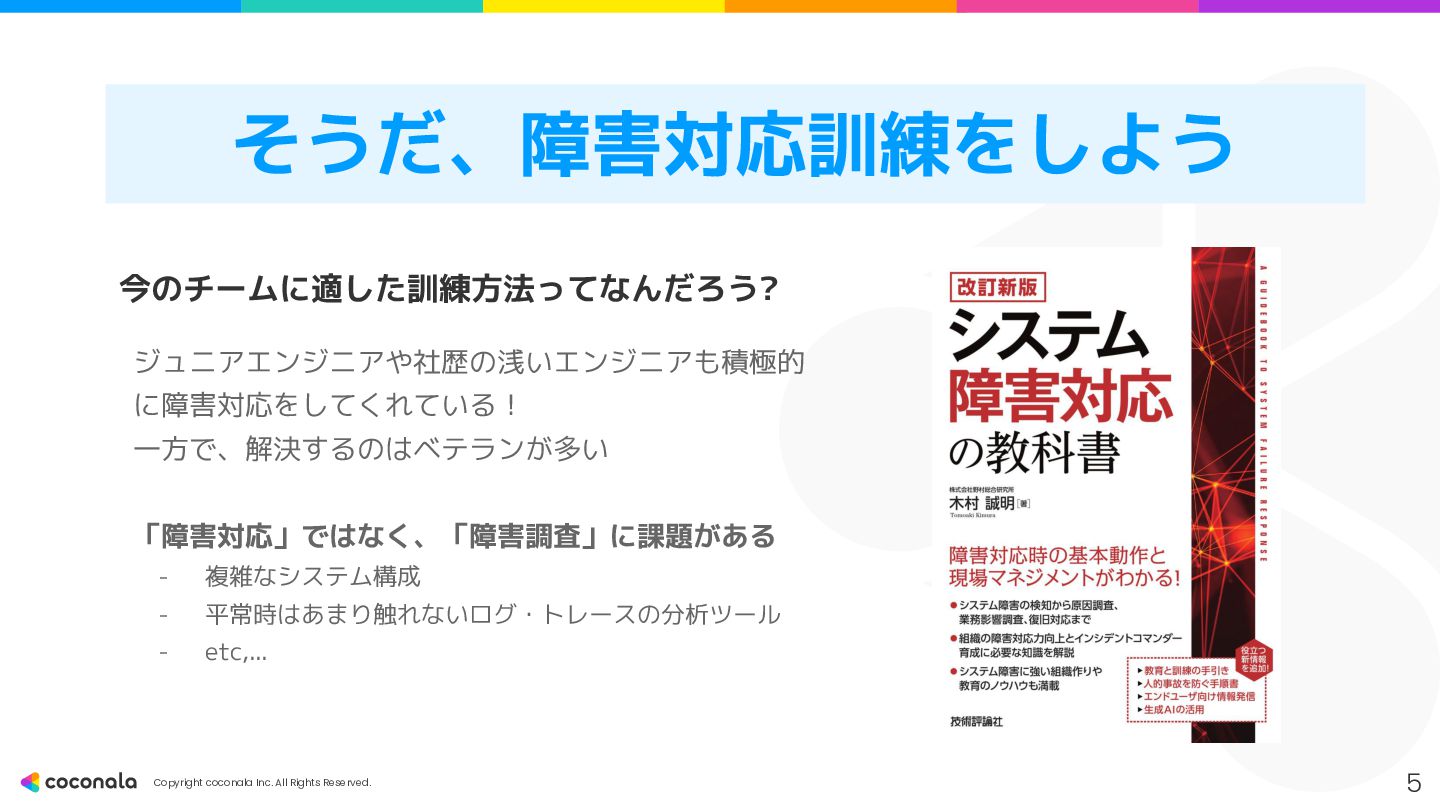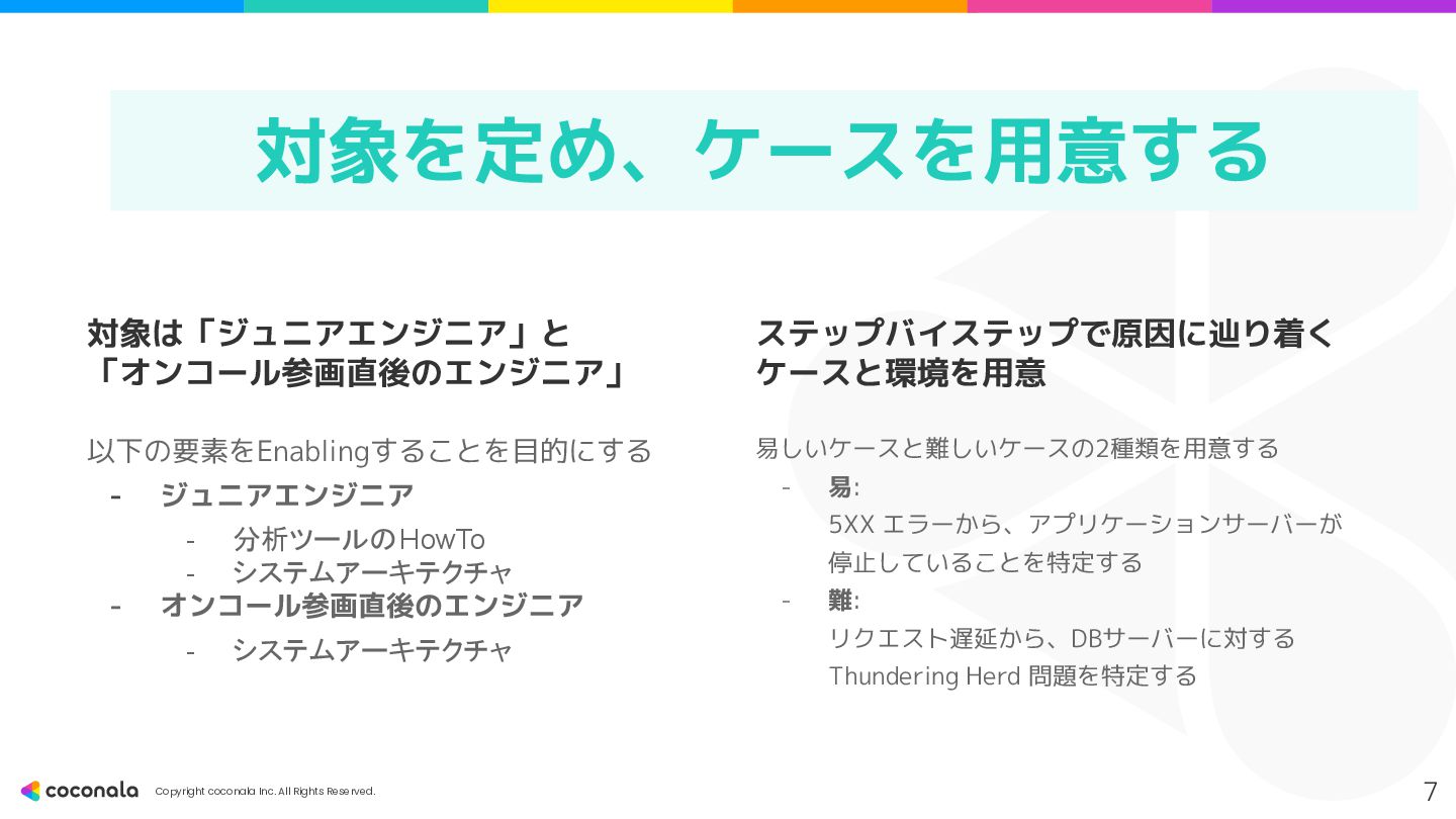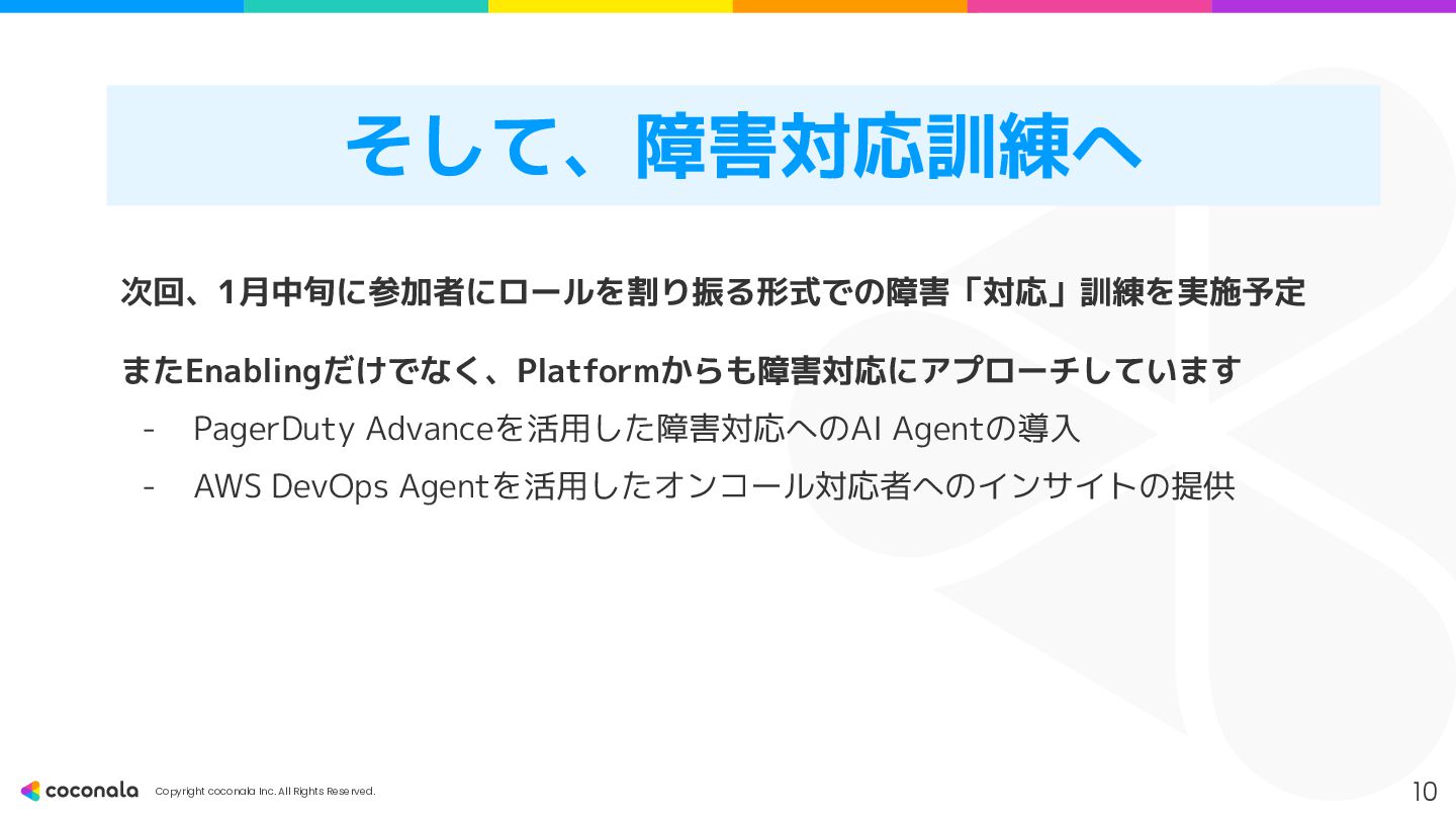た効果への反響があった◎ - 次回開催のお願いや、次回も参加したいという声が得られ、運営 としても手応え◎ - さらに「開発におけるログ設計に活かしたい」といった開発への フィードバックを得た方もいた◎ 振りかえり 大きく3点の課題が見つかった - ケースの難易度設定 難のケースが難しすぎて、学習効率が低下していたのではないか - タイムスケジュールが緩く、練習問題を解ききれなかった 業務時間を割いての実施のため、延長はNGだったのを見越して、 より詳細なスケジュールを立てるべきだった - コミュニケーションを取りながらの障害調査 練習問題はチームを分けて団体競技として実施したが、終始個人 の調査にしてしまっていた 反響と振りかえり 9