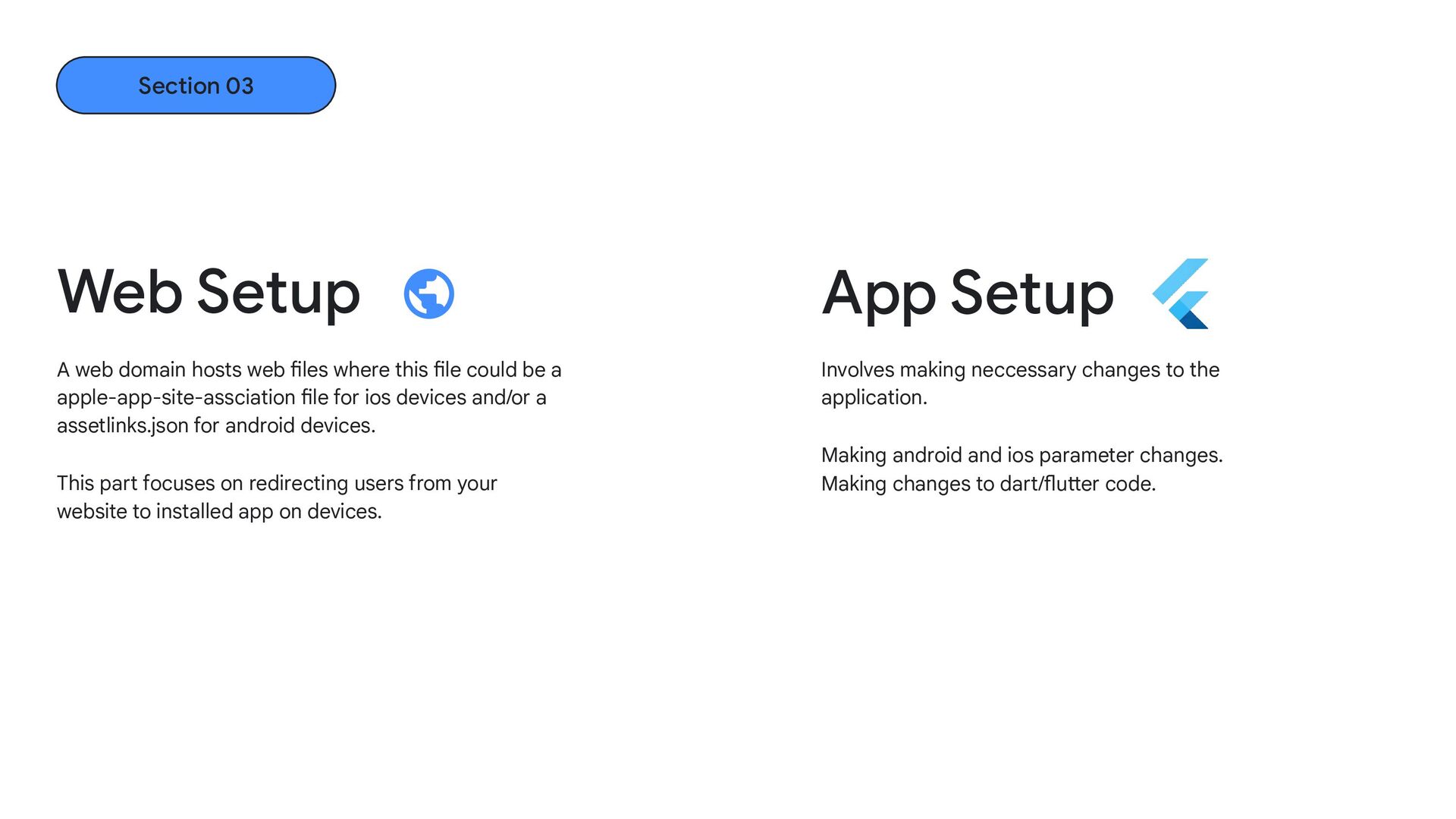 be a apple-app-site-assciation file for ios devices and/or a assetlinks.json for android devices. This part focuses on redirecting users from your website to installed app on devices. Involves making neccessary changes to the application. Making android and ios parameter changes. Making changes to dart/flutter code. App Setup Web Setup Section 03