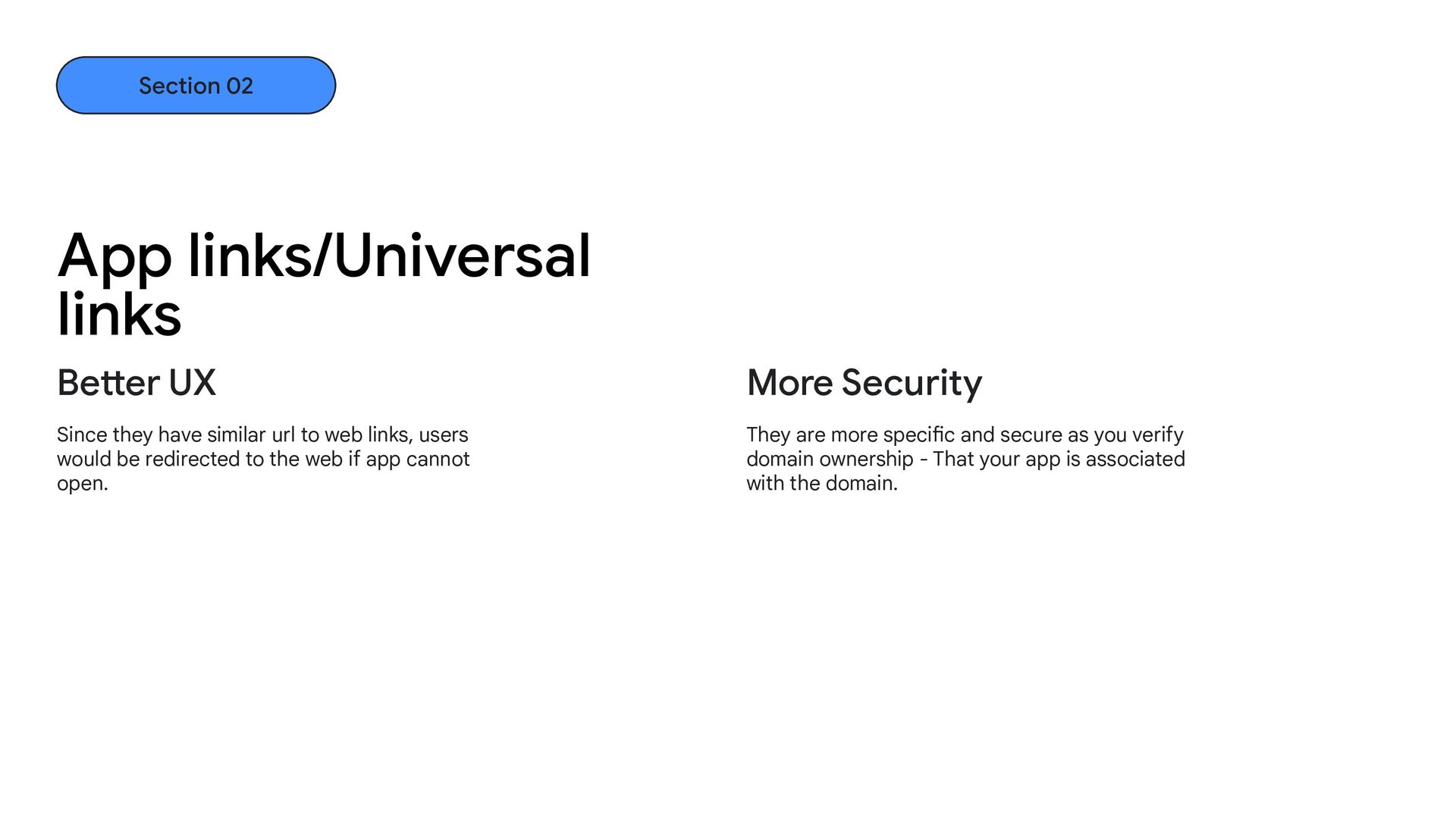 be redirected to the web if app cannot open. They are more specific and secure as you verify domain ownership - That your app is associated with the domain. Better UX More Security App links/Universal links Section 02