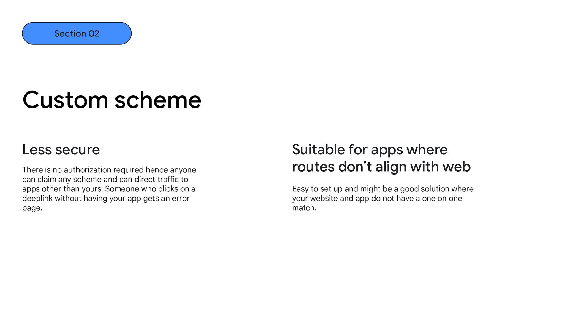 scheme and can direct traffic to apps other than yours. Someone who clicks on a deeplink without having your app gets an error page. Easy to set up and might be a good solution where your website and app do not have a one on one match. Less secure Suitable for apps where routes don’t align with web Custom scheme Section 02