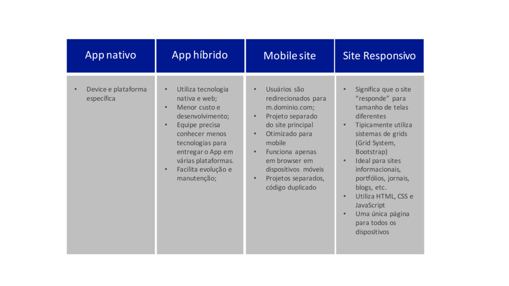 e plataforma específica • Utiliza tecnologia nativa e web; • Menor custo e desenvolvimento; • Equipe precisa conhecer menos tecnologias para entregar o App em várias plataformas. • Facilita evolução e manutenção; • Usuários são redirecionados para m.dominio.com; • Projeto separado do site principal • Otimizado para mobile • Funciona apenas em browser em dispositivos móveis • Projetos separados, código duplicado • Significa que o site “responde” para tamanho de telas diferentes • Tipicamente utiliza sistemas de grids (Grid System, Bootstrap) • Ideal para sites informacionais, porTólios, jornais, blogs, etc. • Utiliza HTML, CSS e JavaScript • Uma única página para todos os dispositivos