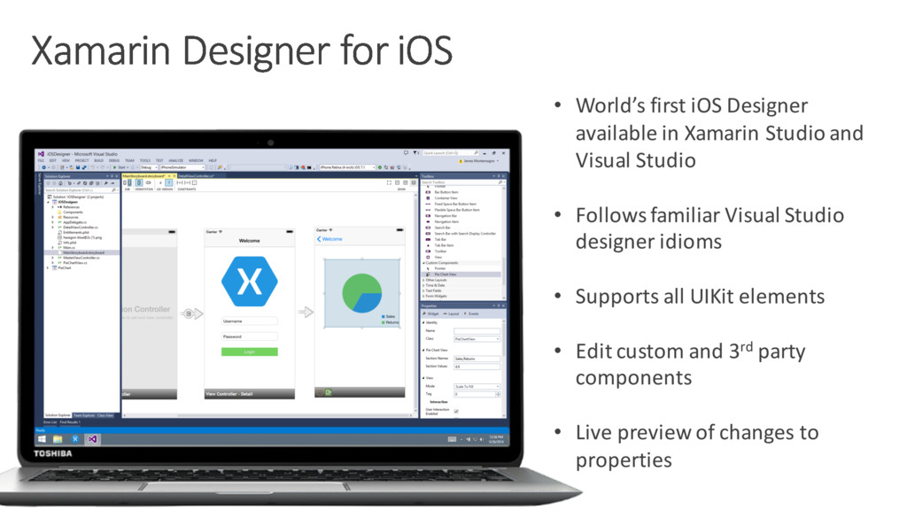 Visual Studio • Follows familiar Visual Studio designer idioms • Supports all UIKit elements • Edit custom and 3rd party components • Live preview of changes to properties