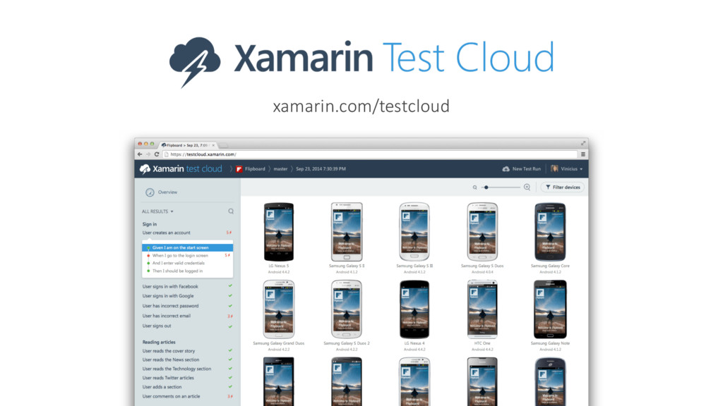 with 500+ locations and $2.8 billion in annual revenue. With its Xamarin apps, Cinemark delights movie-goers and builds customer loyalty, making it easy to locate nearby show times, securely purchase tickets, and eliminate wait times. • Ensures high quality user experience across platforms with Xamarin Test Cloud – 6700+ five-star Google Play ratings • Taps into mobile unique functionality, including social sharing, GPS, and mobile payments • Introduced loyalty program to create direct relationship with previously anonymous movie goers, ensuring repeat visits • Innovative ”Cinemode” silences phones for movie duration, gamifying experience and rewarding customers with ticket coupons