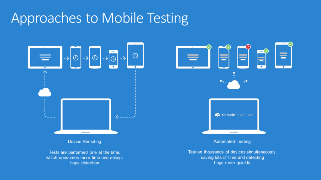 consumes more time and delays bugs detection Automated Testing Test on thousands of devices simultaneously, saving lots of time and detecting bugs more quickly Approaches to Mobile Testing