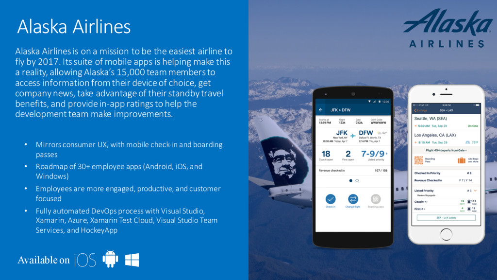 to be the easiest airline to fly by 2017. Its suite of mobile apps is helping make this a reality, allowing Alaska’s 15,000 team members to access information from their device of choice, get company news, take advantage of their standby travel benefits, and provide in-app ratings to help the development team make improvements. • Mirrors consumer UX, with mobile check-in and boarding passes • Roadmap of 30+ employee apps (Android, iOS, and Windows) • Employees are more engaged, productive, and customer focused • Fully automated DevOps process with Visual Studio, Xamarin, Azure, Xamarin Test Cloud, Visual Studio Team Services, and HockeyApp