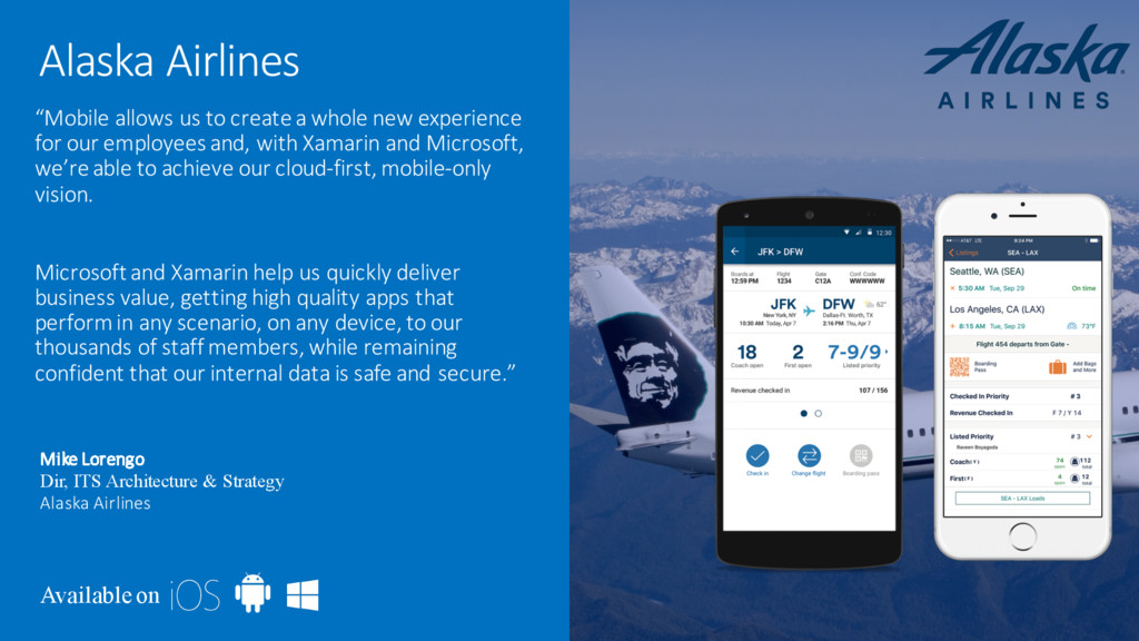 whole new experience for our employees and, with Xamarin and Microsoft, we’re able to achieve our cloud-first, mobile-only vision. Microsoft and Xamarin help us quickly deliver business value, getting high quality apps that perform in any scenario, on any device, to our thousands of staff members, while remaining confident that our internal data is safe and secure.” Mike Lorengo Dir, ITS Architecture & Strategy Alaska Airlines