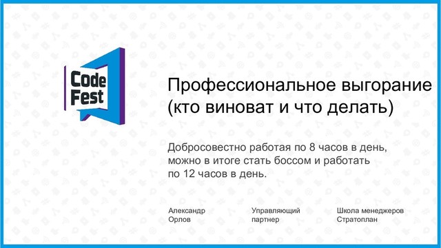 На докладе мы как раз поговорим о том, как понять, на какой стадии к профессиональному выгоранию вы находитесь, чего ожидать дальше и какие пути решения есть.