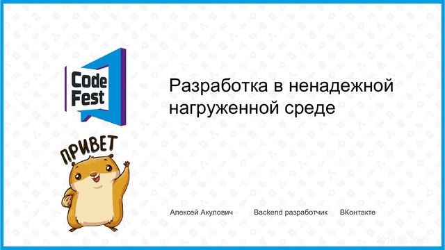 Расскажу, как в ВК идет разработка при постоянных отказах и проблемах софта и железа, приправленных соусом высоких нагрузок. Как пишется код, как ведется автоматизированный мониторинг, про подходы к созданию функционала, немного про деплой. Много компромиссов и велосипедов, всё как мы любим :)