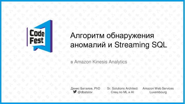 Я расскажу про новый алгоритм обнаружения аномалий Random Cut Forest а также концепцию Streaming SQL для обработки потоковых данных в реальном времени. Покажу пример использования обеих технологий в сервисе Amazon Kinesis Analytics.