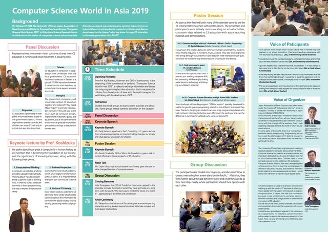 On October 27, 2019, Code for Everyone, together with the University of Tokyo, Japan Association of New Economy, held a conference "Computer Science World in Asia 2019" in Ubiquitous Science Research Center to think about the vision of computer science education in Asia.