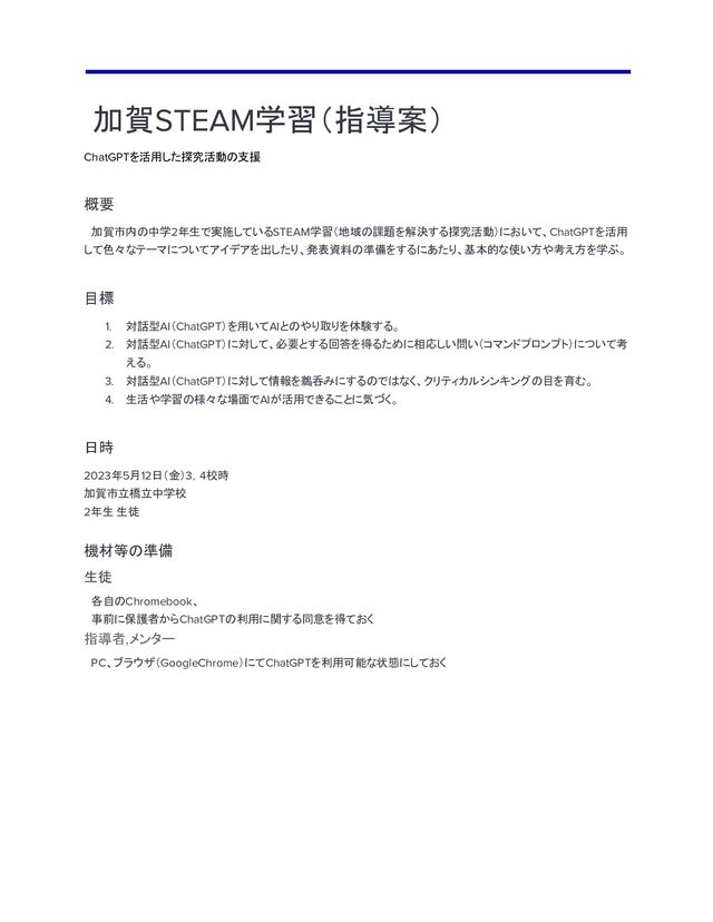 加賀STEAMではテクノロジーはPBLを進め ていくための手段である。 ChatGPTを使う目的を理解する。 ChatGPTを体験してみる (5分) アニメやゲームのことをChatGPTに尋ねてみる。 生徒たちにとってなじみのあるテーマを調べ させる ChatGPTはなぜ間違え る、ウソをつくのか? 出てきた答えが正しいか調べてみる。 Webで、本で、人に直接聞いて... 情報の正しさってどうやって確認するのか考える 生徒にその回答の正しさについて確認させ る、考えさせる(正確さをどうやって確認する かも合わせて) 書籍や公式HPなど確からしいソースを複数 調べる ChatGPTの解説 (5分) ChatGPTのしくみを説明 ・Google検索のように世界中のWebサイトから答えを 探しているわけではない ・言葉をつなぎ合わせて出力しているだけ ・ChatGPTは正解を知らない=答えを尋ねられるのは 得意ではない ・言葉を確率的に導き出して繋いでいるイ メージを持つ ・Google検索で調べられることはそちらを利 用する。 ・そもそもWebページの正確性も疑いながら 利用する心構え ChatGPTの実習 スローガン(5分) 運動会のスローガンを作ってみる。 アイデアを広げる活動を体験する アイデアを複数出させて、そこから自分たち で選んでいく作業を体験する 入れたい単語やイメージ、分掌の長さなどを 意識させる ChatGPTの実習 しりとり(10分) しりとりのルールを入力しながら、しりとりゲームを 作っていく。 完成したら、メンバー同士で遊んでみる。 隣のチームと対戦させてもよい。 班ごと3〜4名に分かれる 教員、メンターのPCでChatGPTを動作さ せ、入力する 指示を重ねるごとに動作が正確になっていく 様子をみる 参考資料 ChatGPTの得意なこと/ 苦手なこと ◦アイデアを出してくれる ◦文章をまとめてくれる ×情報の出所が不明 ×情報が最新でない ・答えを教えてもらうのではなく、相談に乗っ てもらうイメージ ・Googleなどで検索すれば済むことは検索 サイトで調べる 休み時間(10分)