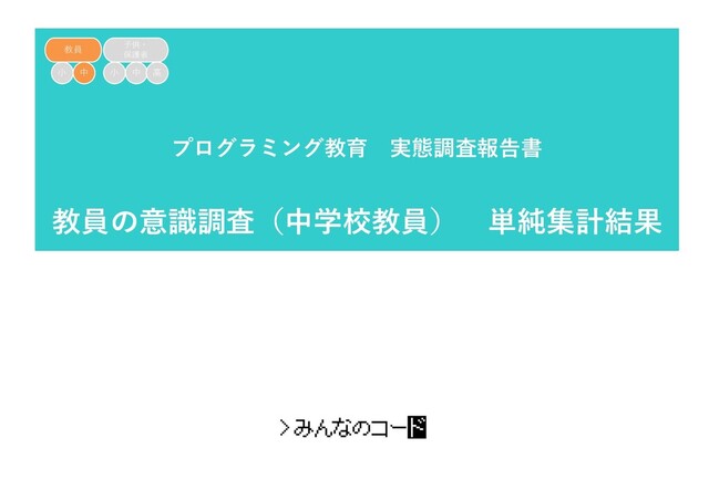 全国でテクノロジー教育の普及活動を推進する特定非営利活動法人みんなのコードが、 Google.org の支援のもと、日本国内の学校教育におけるプログラミング教育の実態について、全国の小学校教員1,037名、中学校教員1,362名、小学生・中学生・高校生およびその保護者3,000組を対象に、定量・定性調査を実施した報告書の「教員の意識調査(中学校教員)単純集計結果」です。