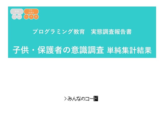 全国でテクノロジー教育の普及活動を推進する特定非営利活動法人みんなのコードが、 Google.org の支援のもと、日本国内の学校教育におけるプログラミング教育の実態について、全国の小学校教員1,037名、中学校教員1,362名、小学生・中学生・高校生およびその保護者3,000組を対象に、定量・定性調査を実施した報告書の「子ども・保護者の意識調査 単純集計結果」です。