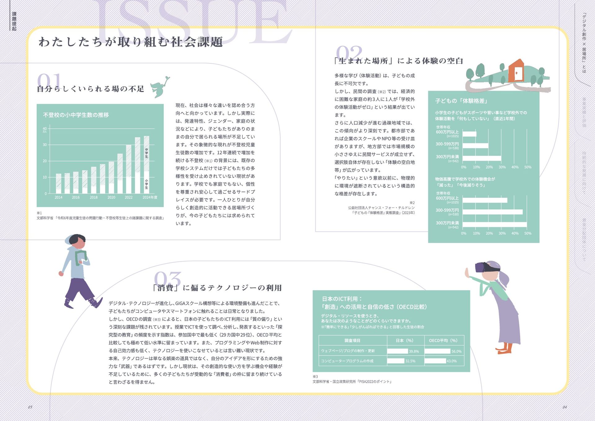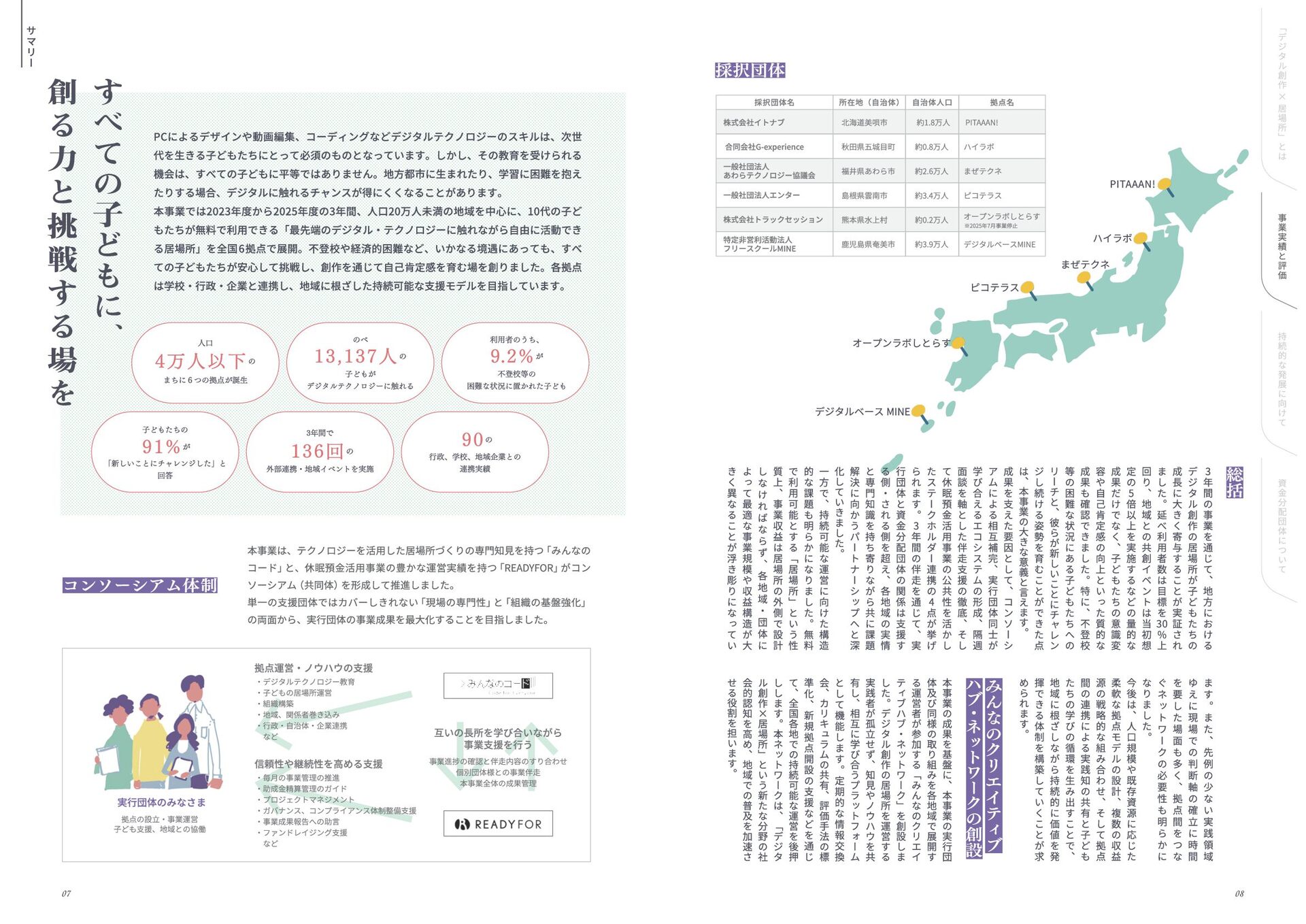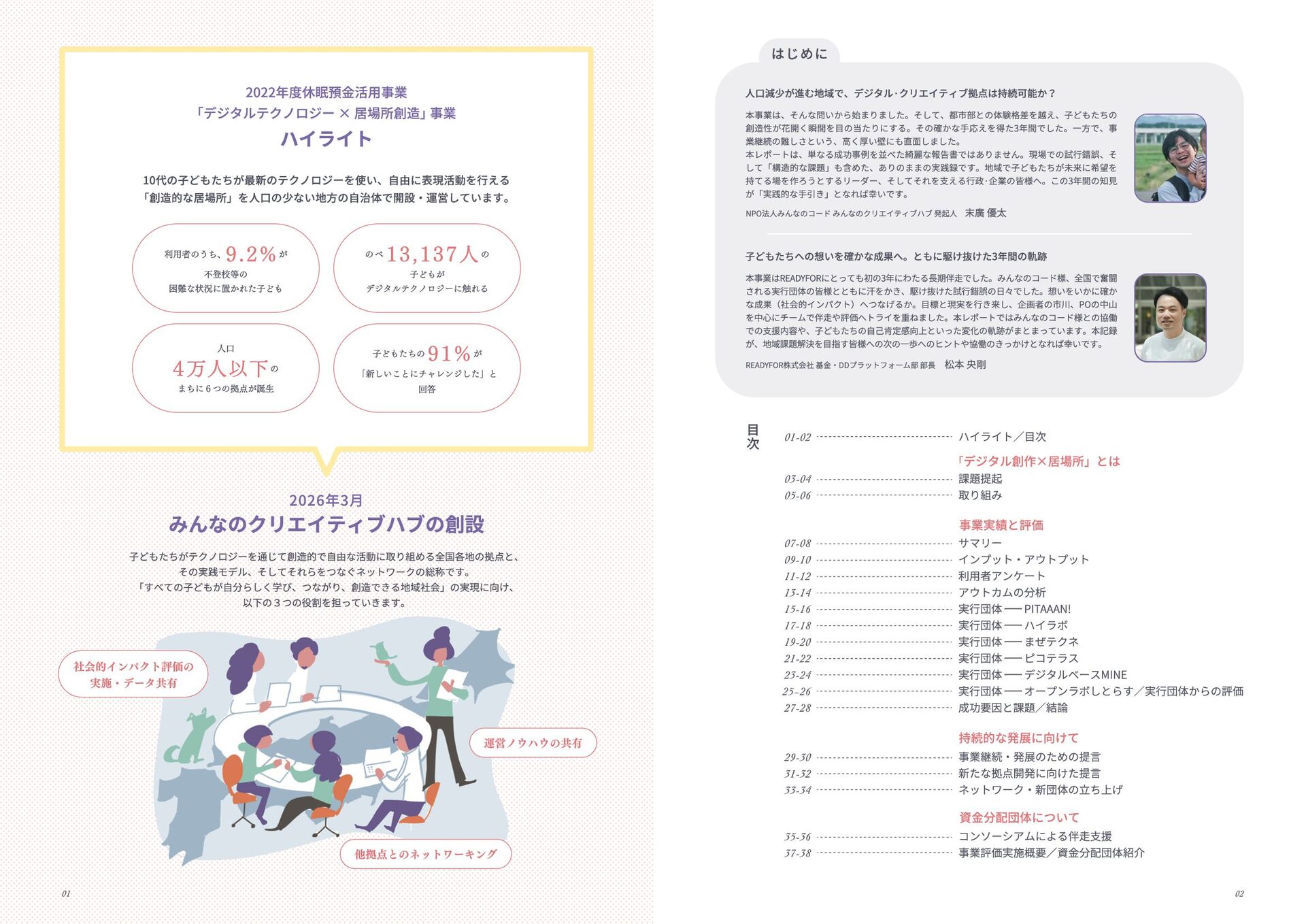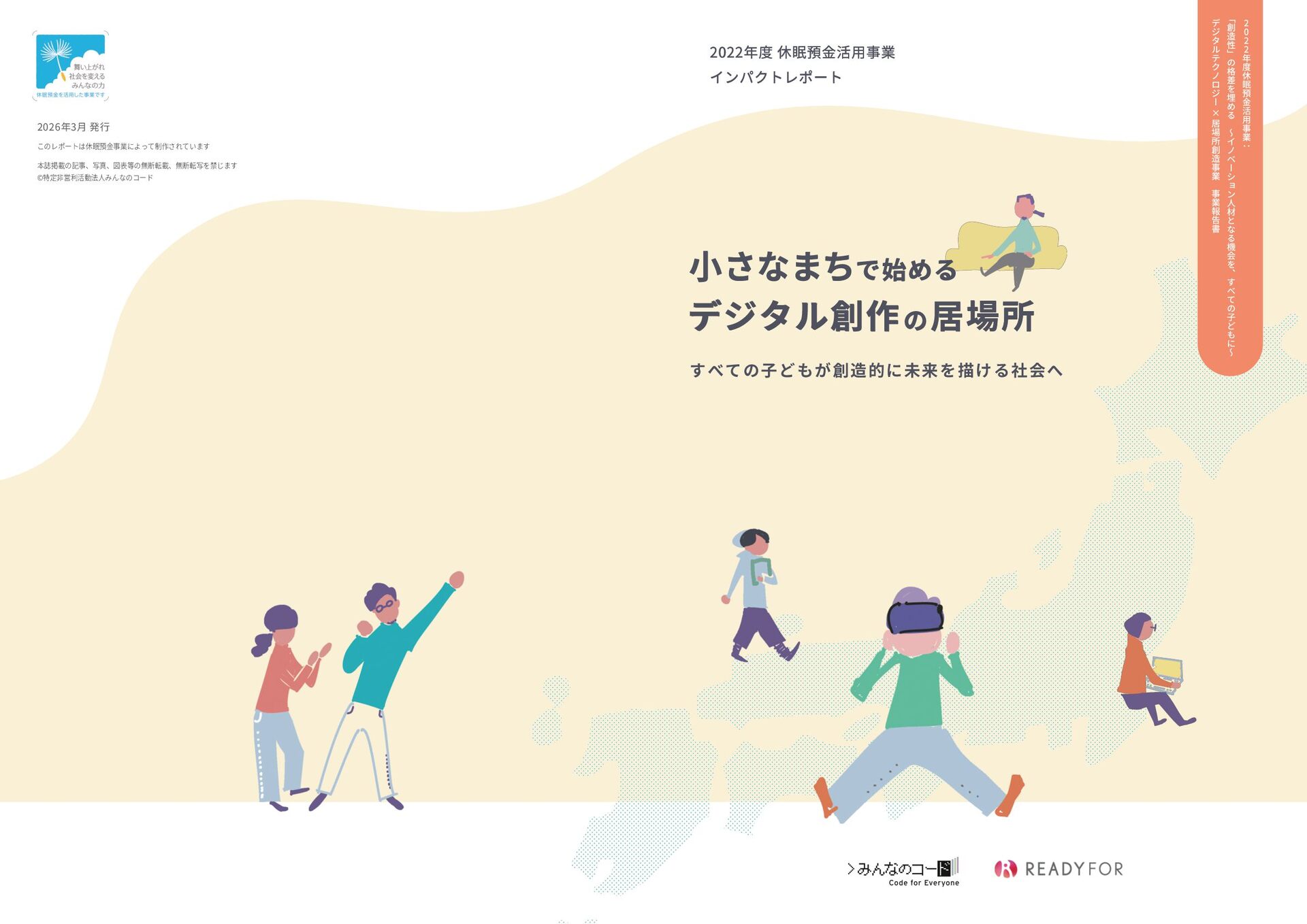 年 度 休 眠 預 金 活 用 事 業 : ﹁ 創 造 性 ﹂ の 格 差 を 埋 め る   ~ イ ノ ベ ー シ ョ ン 人 材 と な る 機 会 を ︑ す べ て の 子 ど も に ~ デ ジ タ ル テ ク ノ ロ ジ ー × 居 場 所 創 造 事 業   事 業 報 告 書 このレポートは休眠預金事業によって制作されています 小さなまちで始める デジタル創作の居場所 本誌掲載の記事、写真、図表等の無断転載、無断転写を禁じます ©特定非営利活動法人みんなのコード