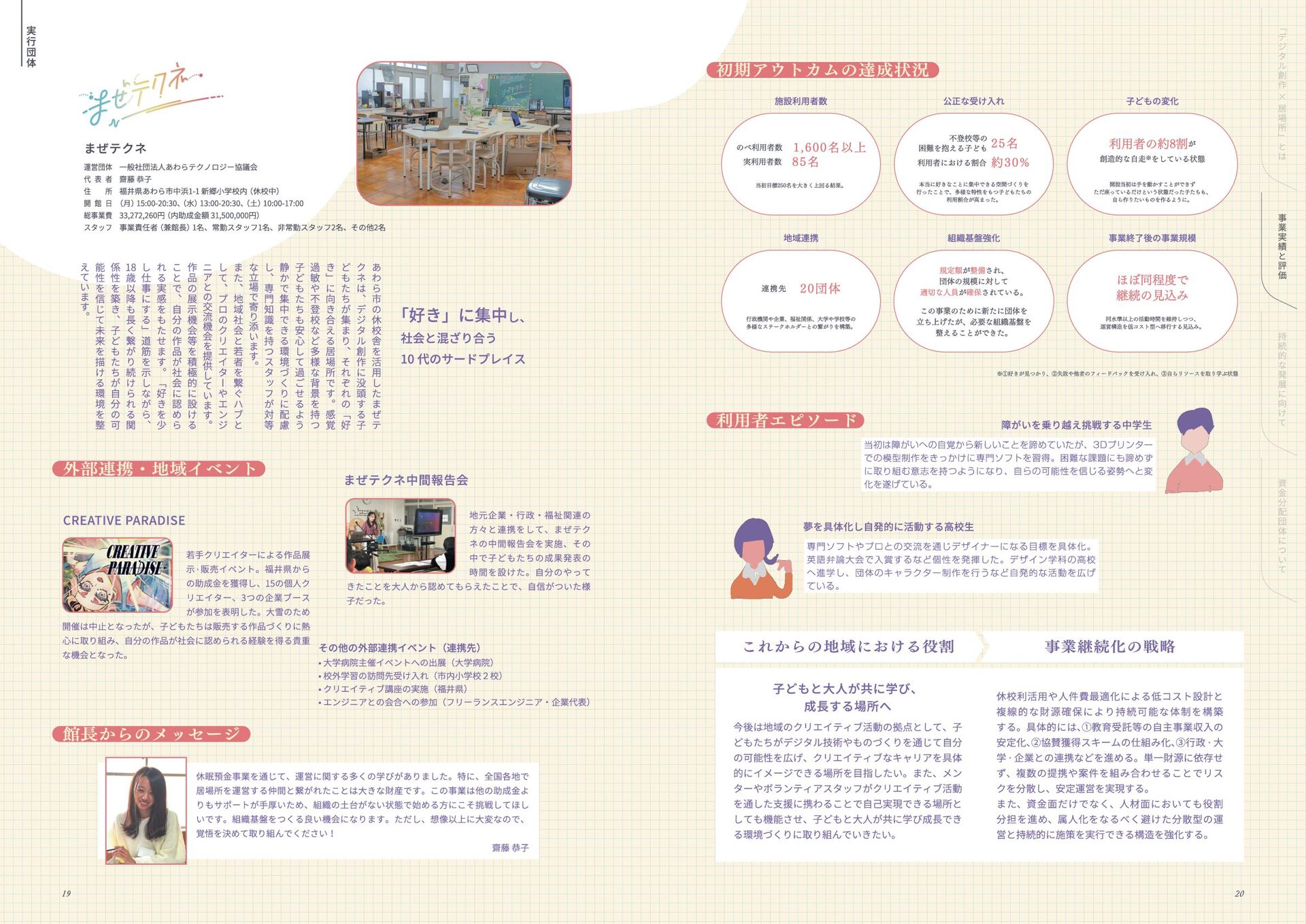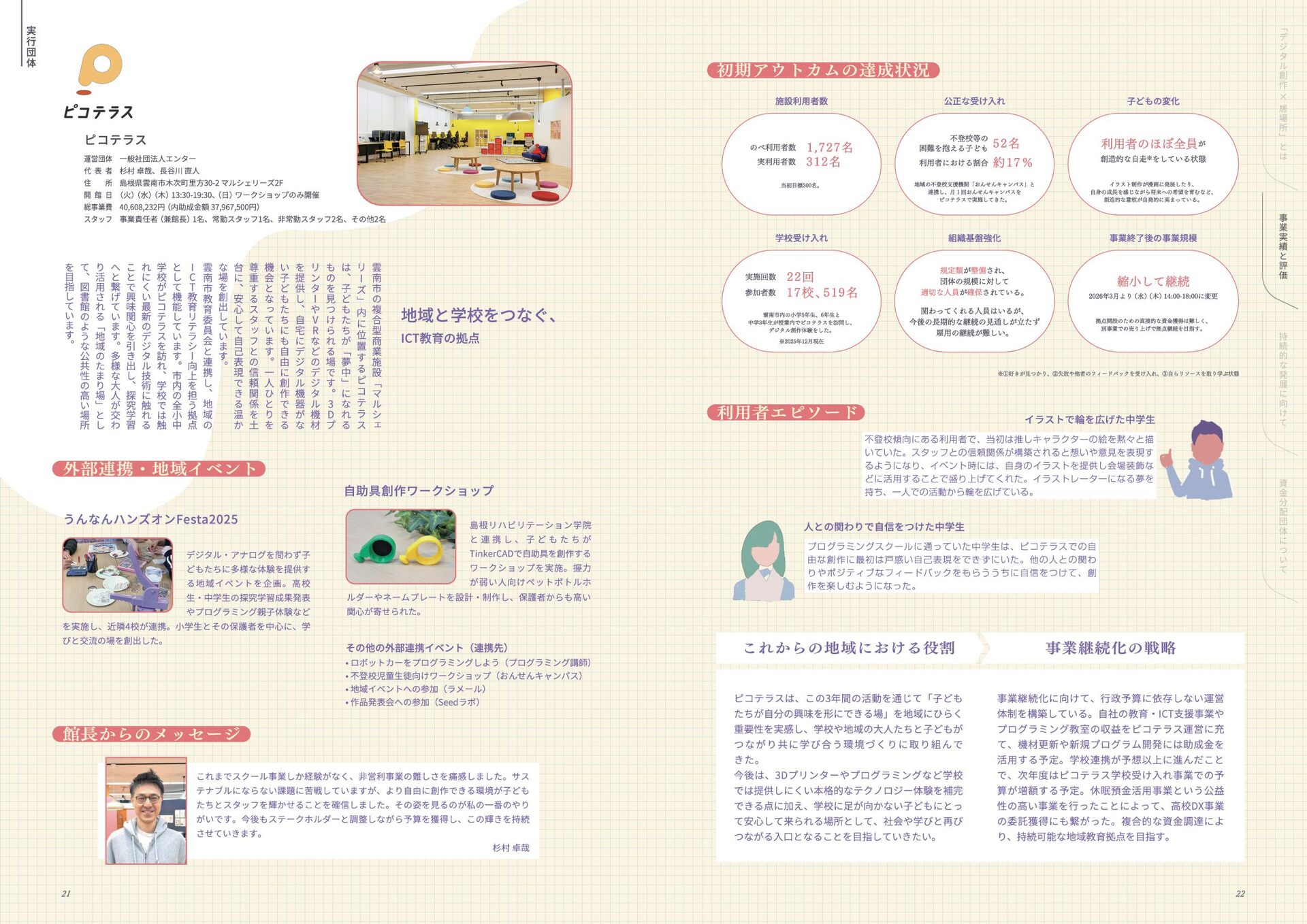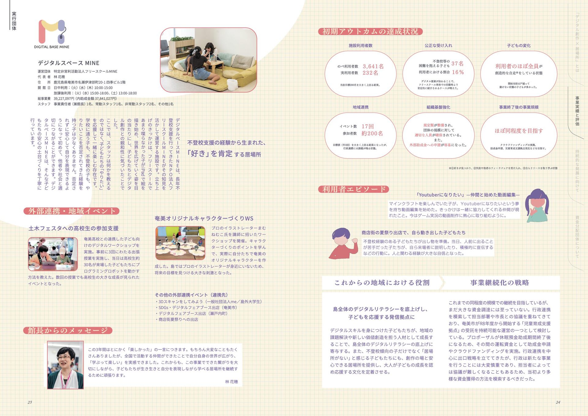 年 度 休 眠 預 金 活 用 事 業 : ﹁ 創 造 性 ﹂ の 格 差 を 埋 め る   ~ イ ノ ベ ー シ ョ ン 人 材 と な る 機 会 を ︑ す べ て の 子 ど も に ~ デ ジ タ ル テ ク ノ ロ ジ ー × 居 場 所 創 造 事 業   事 業 報 告 書 このレポートは休眠預金事業によって制作されています 小さなまちで始める デジタル創作の居場所 本誌掲載の記事、写真、図表等の無断転載、無断転写を禁じます ©特定非営利活動法人みんなのコード