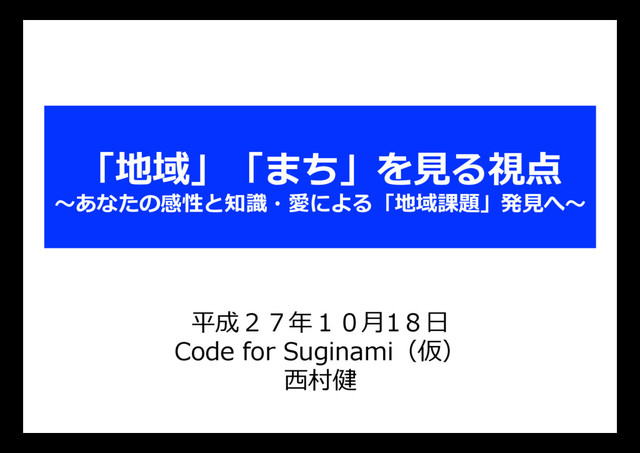 「地域」「まち」を⾒見見る視点 〜~あなたの感性と知識識・愛による「地域課題」発⾒見見へ〜~ 平成27年年10⽉月18⽇日 Code for Suginami(仮) ⻄西村健
