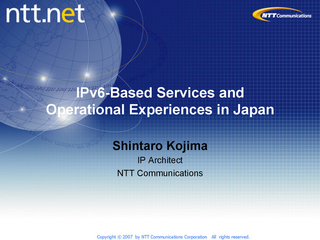 Agenda • About NTT • IPv6/IPv4 Dual Stack Backbone and Operations • How IPv4 Depletion Make Impacts on Access Provider and Enterprise Business • IPv6 Products and Services Offered by NTT • Summary