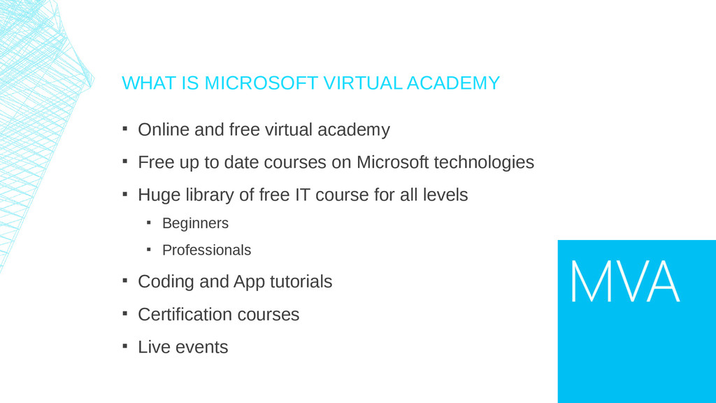 academy ▪ Free up to date courses on Microsoft technologies ▪ Huge library of free IT course for all levels ▪ Beginners ▪ Professionals ▪ Coding and App tutorials ▪ Certification courses ▪ Live events