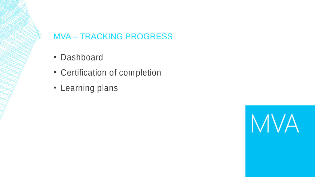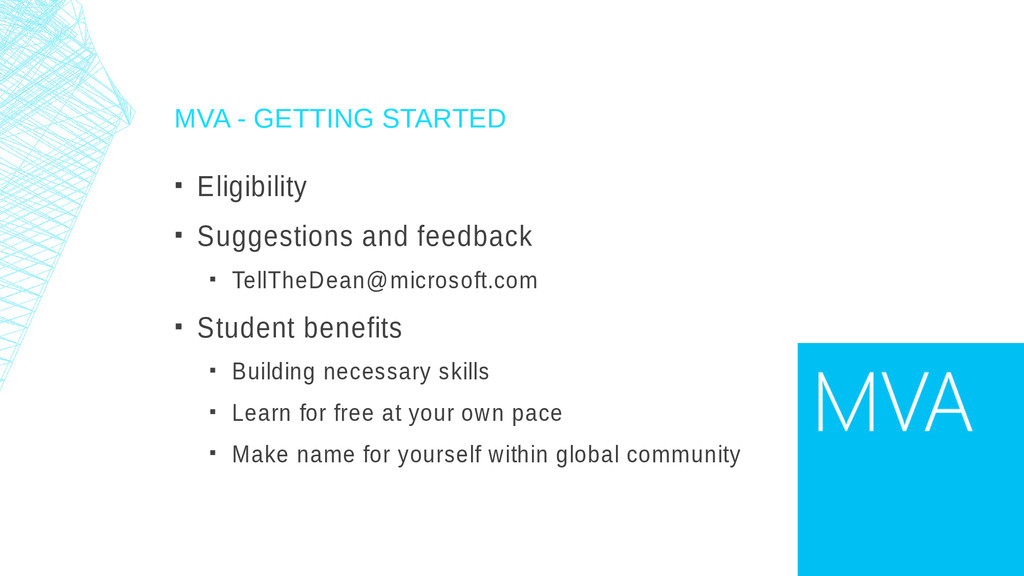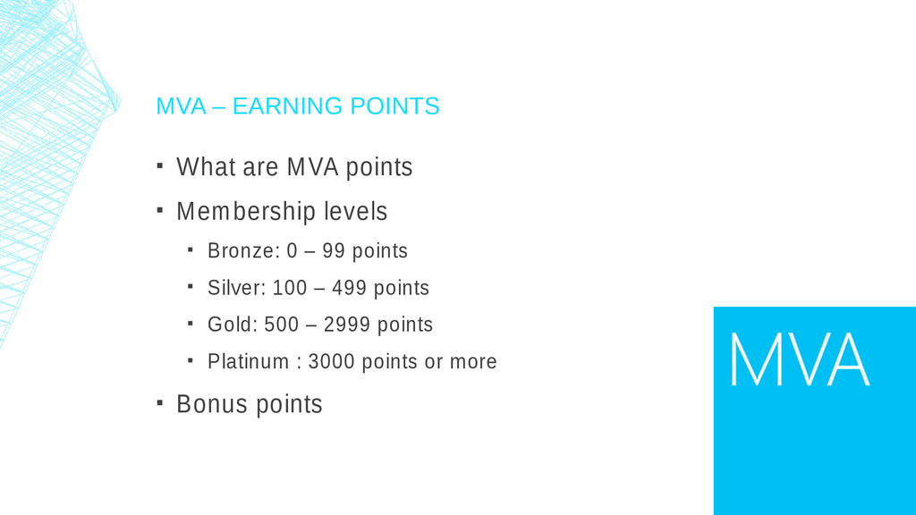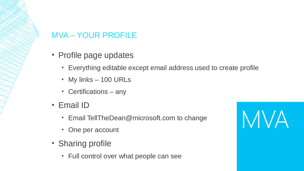 used to create profile ▪ My links – 100 URLs ▪ Certifications – any ▪ Email ID ▪ Email [email protected] to change ▪ One per account ▪ Sharing profile ▪ Full control over what people can see MVA – YOUR PROFILE