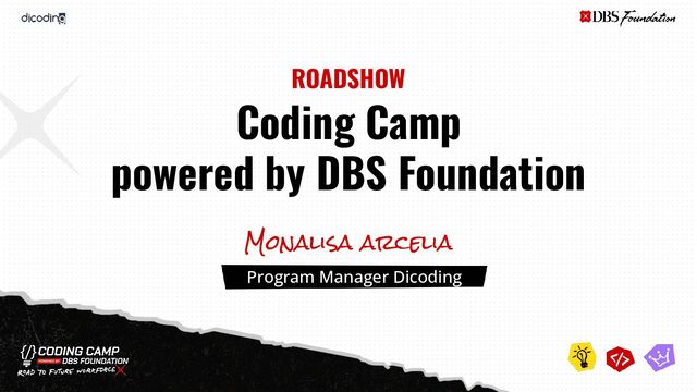 x Dicoding, didirikan pada 2023, bertujuan meningkatkan keterampilan digital pengembang IT masa depan Indonesia. Inisiatif ini merupakan bagian dari Community Impact DBS Foundation, yang fokus pada pemberdayaan sosial. DBS Foundation Coding Camp juga mendukung difabel, perempuan, pendidik, dan warga berpenghasilan rendah. Back-End Developer | DevOps Engineer | Front-End Web Developer | Machine Learning Engineer Alur belajar diberikan pada program tahun 2023 - 2024 114,072 Penerima Manfaat 26,999 Wanita 6,193 Pendidik 22,104 Warga Negara yang Termarginalisasi 946 Disabilitas Data Kumulatif antara program tahun 2023 dan 2024