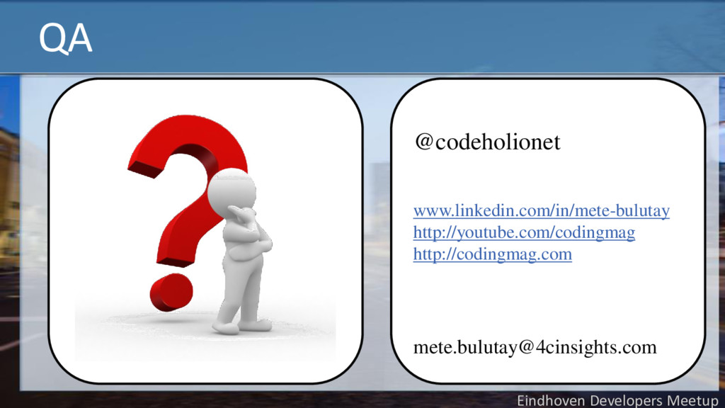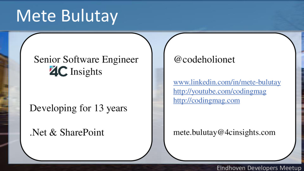 Mete Bulutay Eindhoven Developers Meetup @codeholionet www.linkedin.com/in/mete-bulutay http://youtube.com/codingmag http://codingmag.com